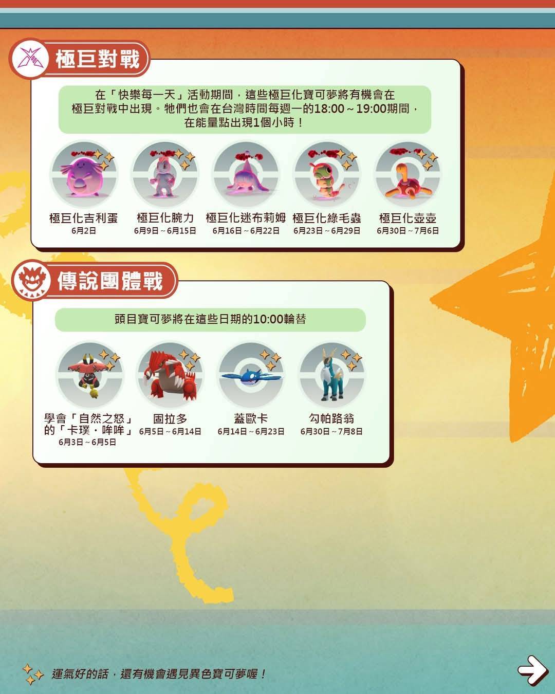Dynamax Danji:6月30日 – 7月6日 (註:以上 “Lucky”, “Altmon”, “Body Jibril”, “Danji”, “Caterpie” 可能是活動中特定極巨化寶可夢的代稱或主題名稱,Caterpie 為綠毛蟲,其餘非標準寶可夢名稱)