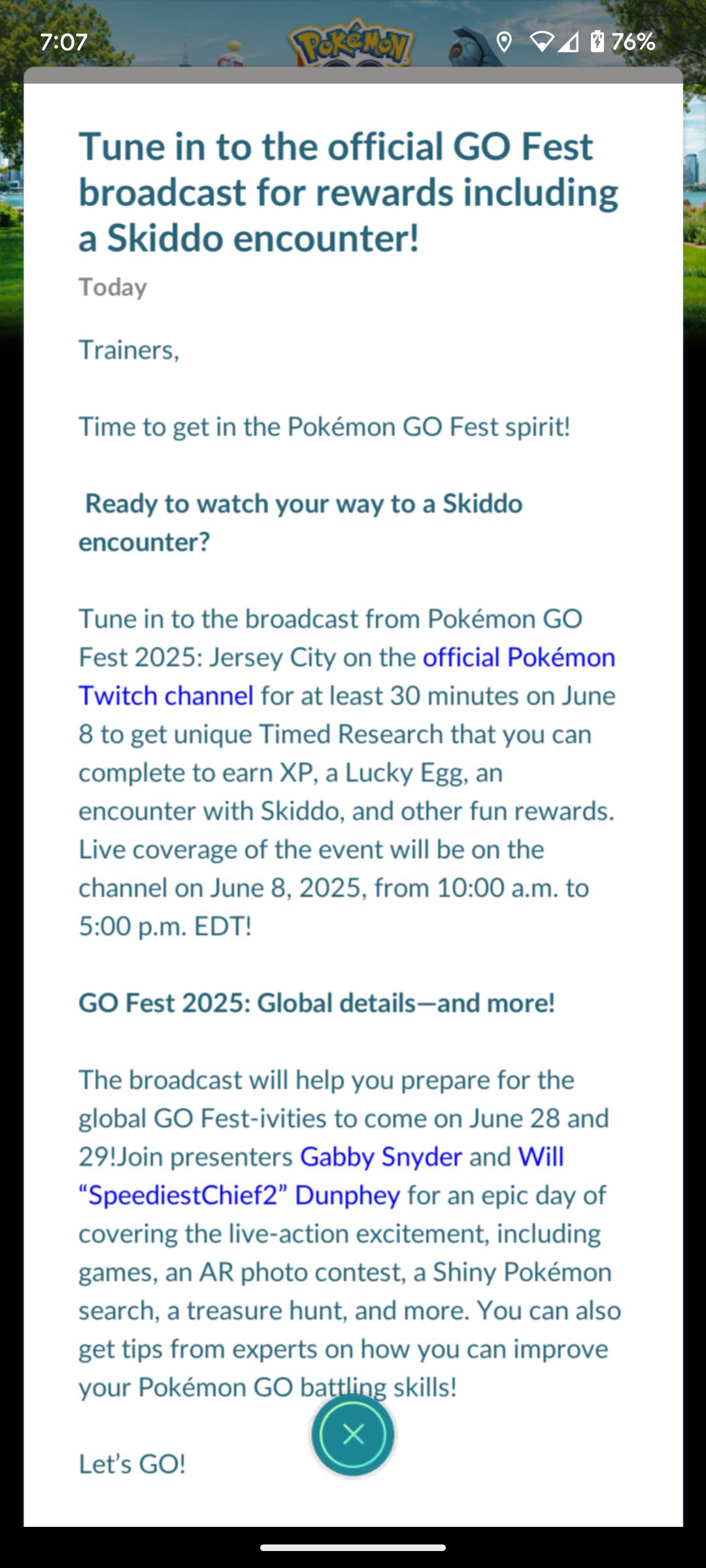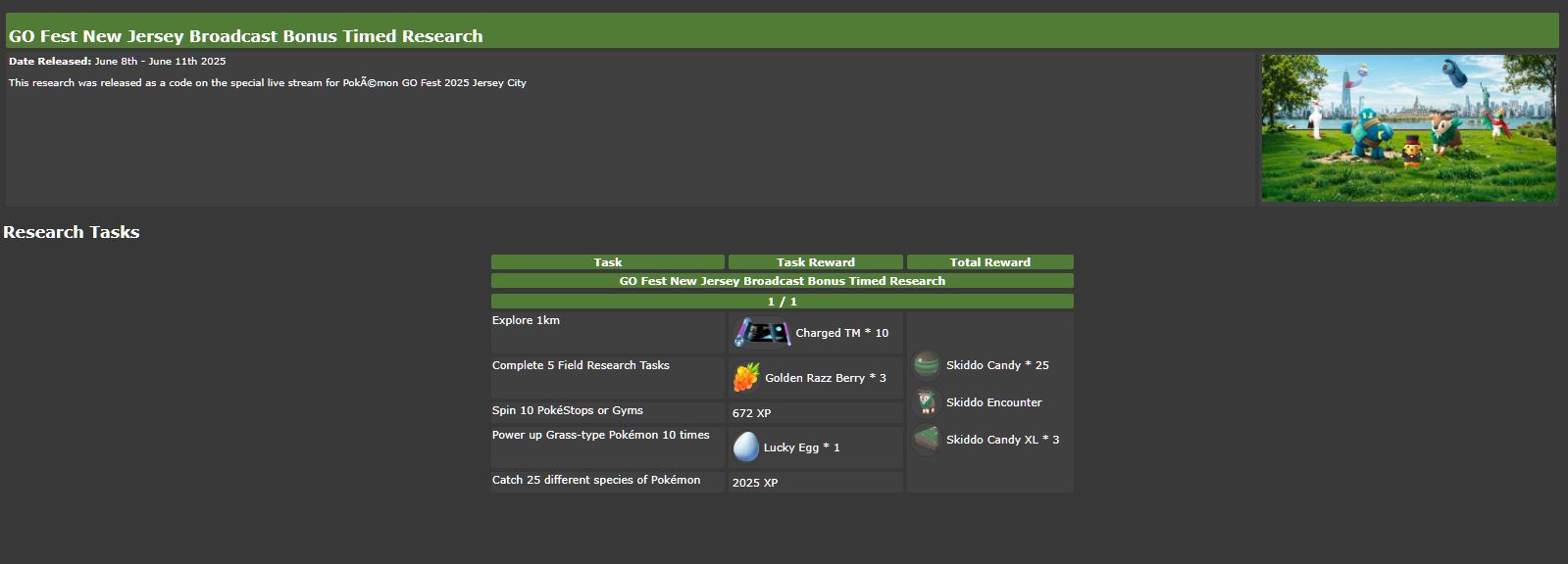 Tune in to the broadcast from Pokémon GO Fest 2025: Jersey City on the official Pokémon Twitch channel for at least 30 minutes on June 8 to get unique Timed Research that you can complete to earn XP, a Lucky Egg, an encounter with Skiddo, and other fun rewards. Live coverage of the event will be on the channel on June 8, 2025, from 10:00 a.m. to 5:00 p.m. EDT!