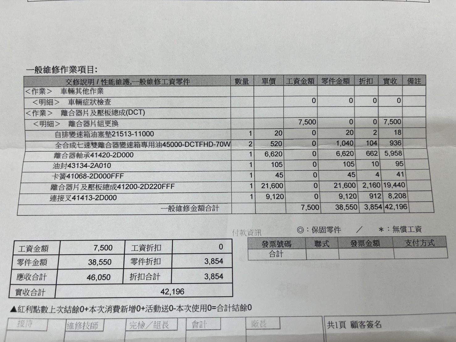 TUCSON 現代汽車 變速箱離合器更換價格費用 發佈日期: 2025-06-18 作者: tomchun ※本篇內文資訊參考如下※ - - ※更新文章日期: 2025-06-18 TUCSON 現代汽車 變速箱離合器更換價格費用 – 維修紀錄參考 @李榮漢 台灣TUCSON家族(Taiwan Tucson Family) 2019年11月,TUCSON 公里數:11萬6 高速公路/市區里程比例約7:3 進廠狀況:抖動、加油不順會斷油的狀況 以上提供大家參考 – –