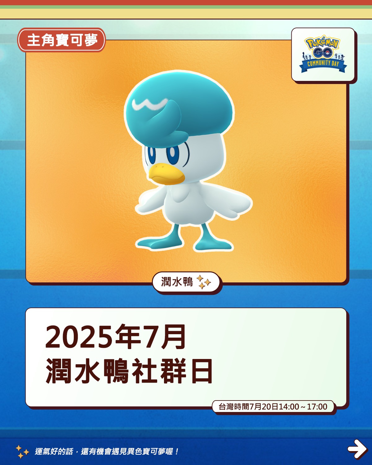 7月社群日的主角是小鴨寶可夢「潤水鴨」!