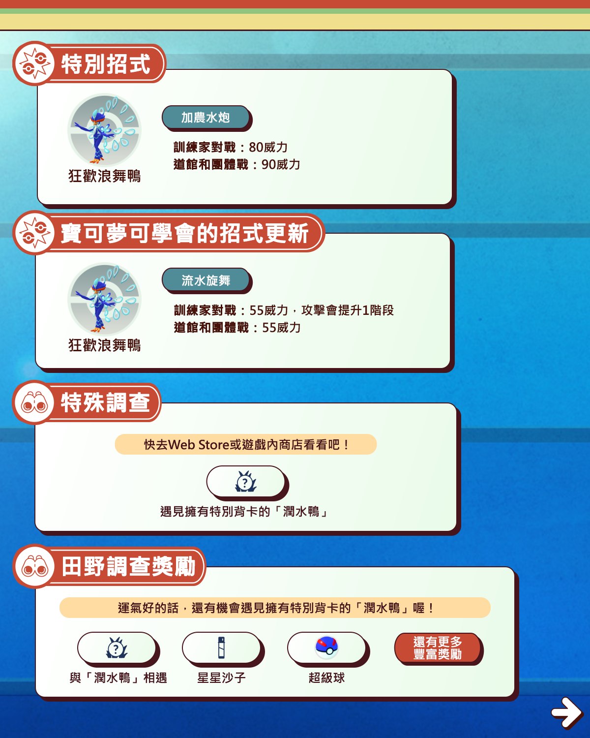 各位訓練家也別忘了,只要在社群日活動結束後的一週內讓「湧躍鴨」(「潤水鴨」的進化形)進化,就能獲得學會特殊招式「加農水炮」的「狂歡浪舞鴨」!