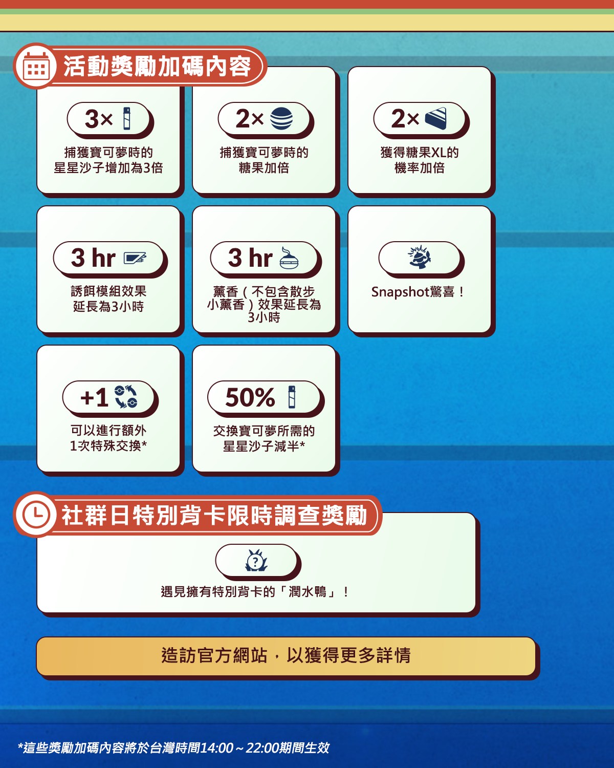 * 大部分獎勵僅限活動的3小時期間生效,這些獎勵則會於台灣時間14:00~22:00期間生效。