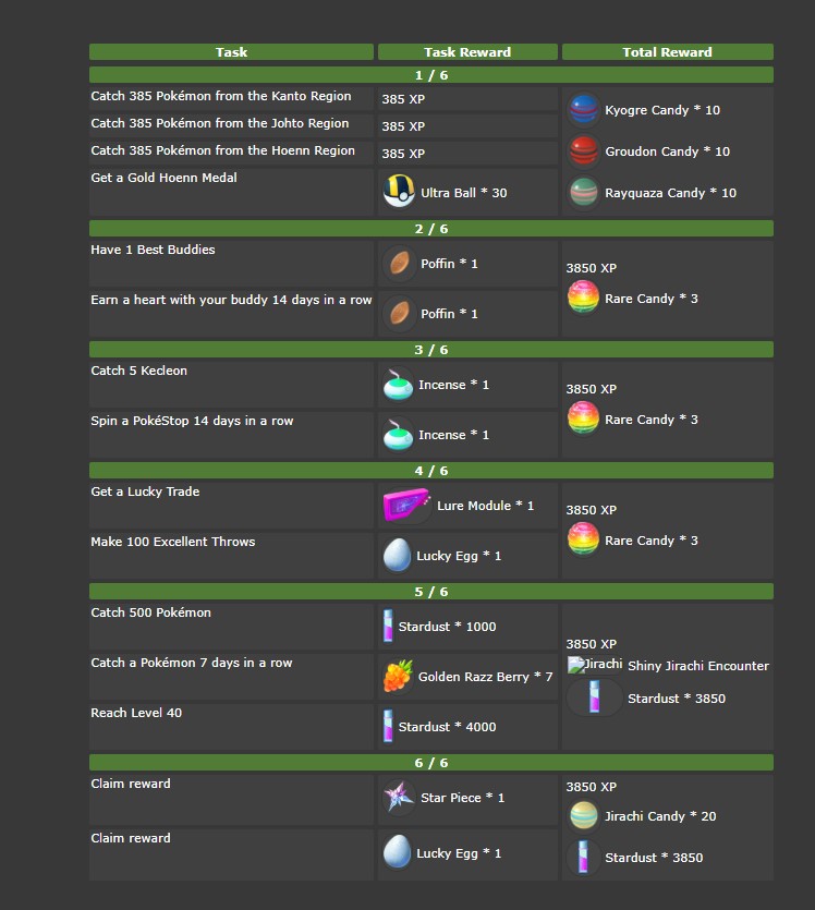 Rewards: 3,850 XP, Shiny Jirachi encounter, 3,850 Stardust