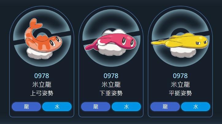 傑尼龜*呆呆獸*大鉗蟹*海星星*鯉魚王*瑪力露*泥泥鰍*珍珠貝*泳圈鼬*螢光魚*膽小蟲*
