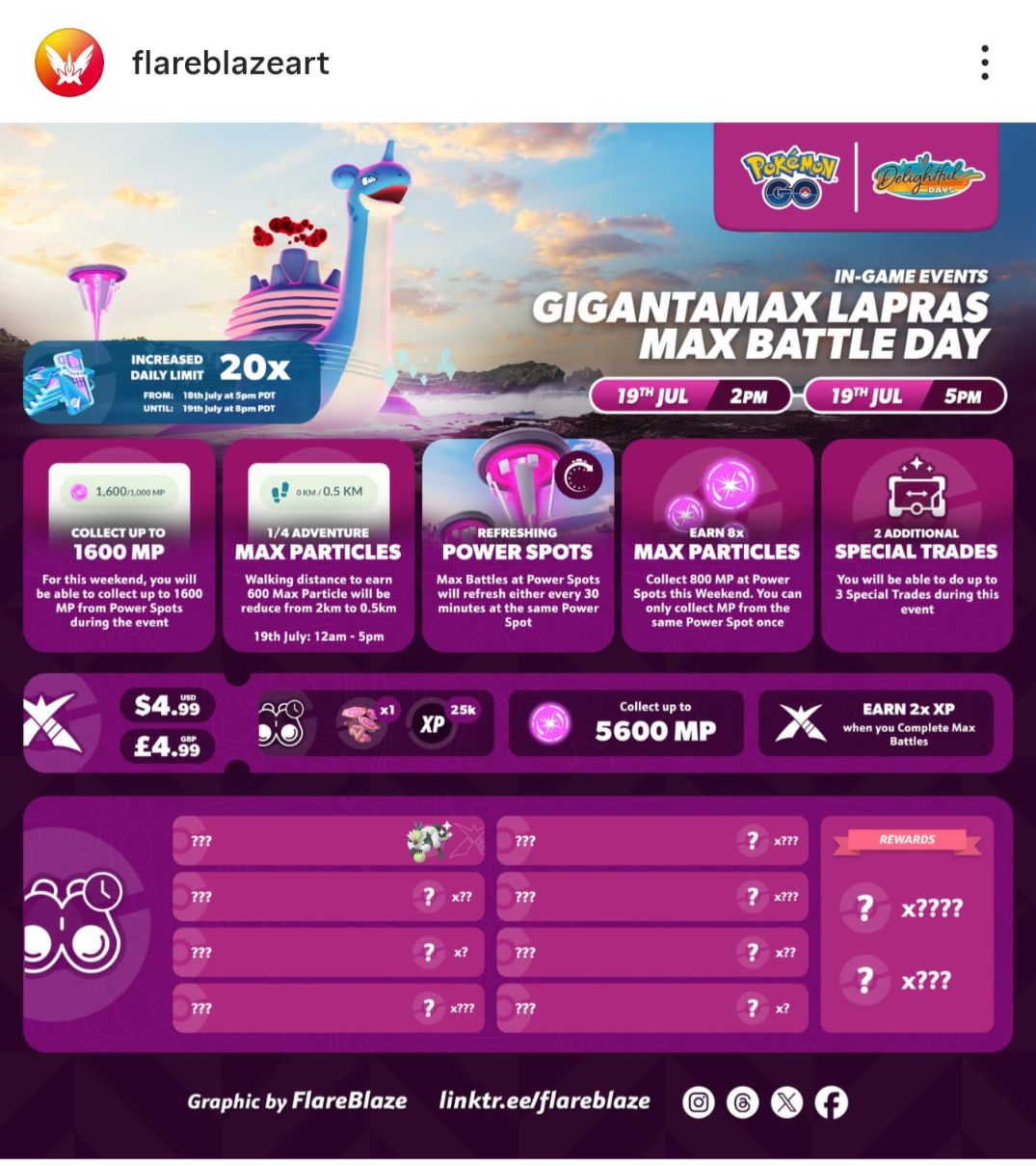 The Gigantamax Lapras Max Battle Day Ultra Ticket Box will be available for US$4.99. It includes an event ticket and a bonus Max Particle Pack at no additional cost.