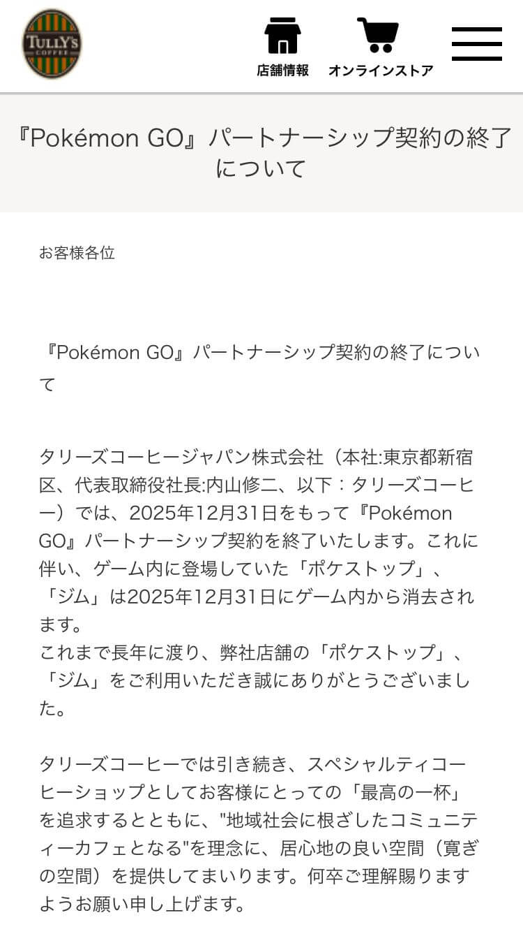 タリーズコーヒーの『Pokémon GO』パートナーシップ契約終了が発表されています。