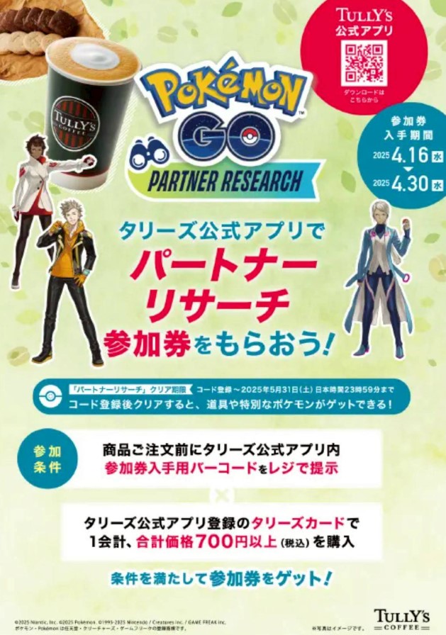 Pokémon GO 合作夥伴研究 參與券贈送活動概要 舉辦期間 2025年4月16日(三)〜2025年4月30日(三) 活動實施門市 全國Tully’s Coffee店(部分無法使用Tully’s卡的店鋪除外) 適用條件 使用註冊於「Tully’s 官方應用程式」的Tully’s卡,單筆消費700日圓以上(含稅),並在點餐前出示App內的條碼 參與券分發 將於符合資格後48小時內在應用程式內發放 タ時間挑戰賽參賽期間 兌換優惠碼後,有效期限至2025年5月31日(六)日本時間23點59分