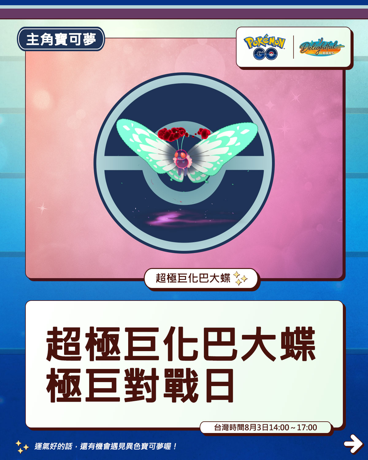 我們很高興能夠宣布,超極巨化「巴大蝶」即將在《Pokémon GO》六星極巨對戰首度登場!