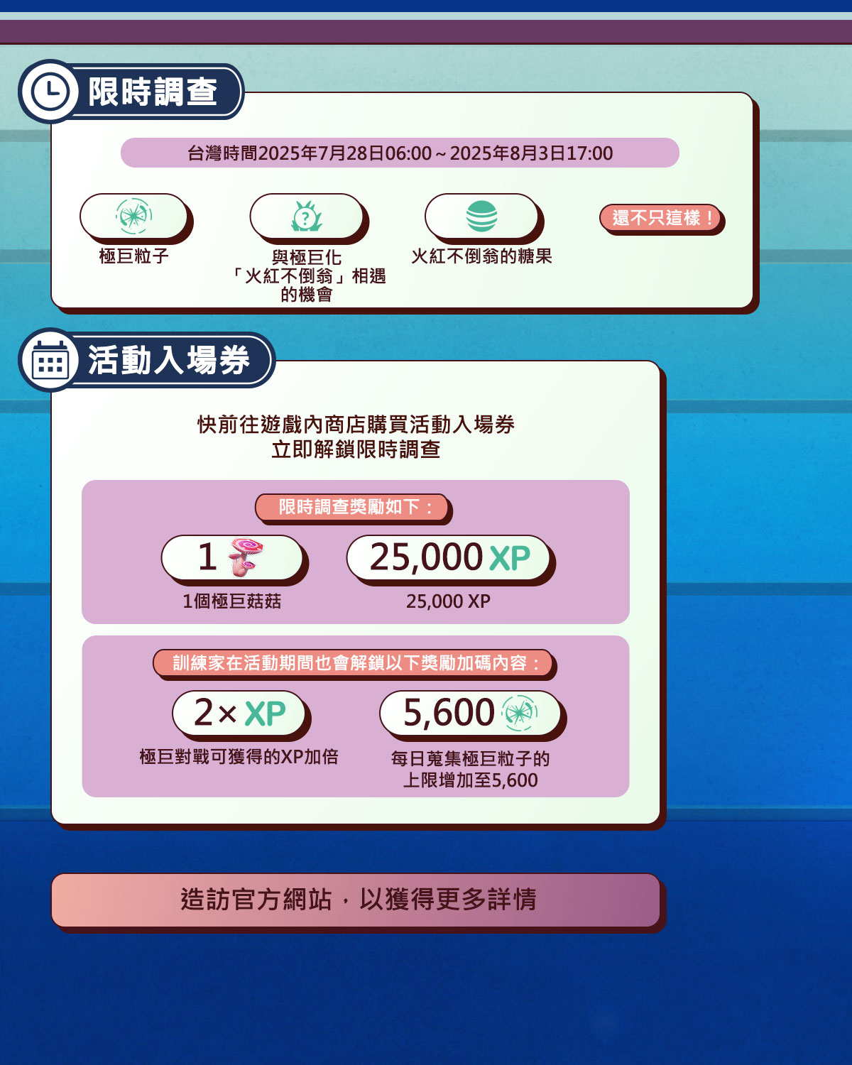 只要完成限時調查,就可以遇見極巨化寶可夢。牠會是幫助訓練家挑戰超極巨化「巴大蝶」的可靠夥伴!除此之外,限時調查的獎勵內容也包含能用來升級對戰小隊的糖果和極巨粒子!