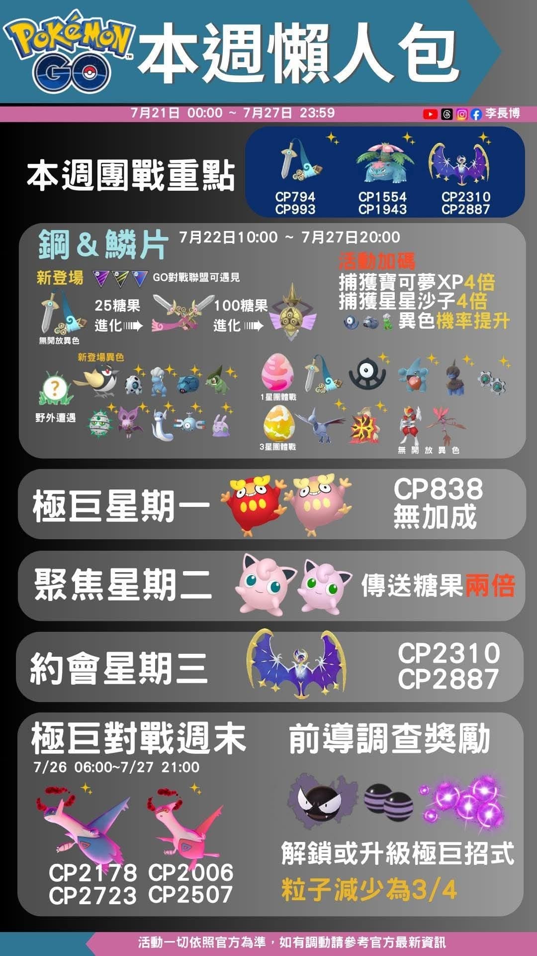 07/21 本週 Pokemon GO 活動資訊提醒、聚焦時刻、BOSS團體戰頭目表、其他活動 2025