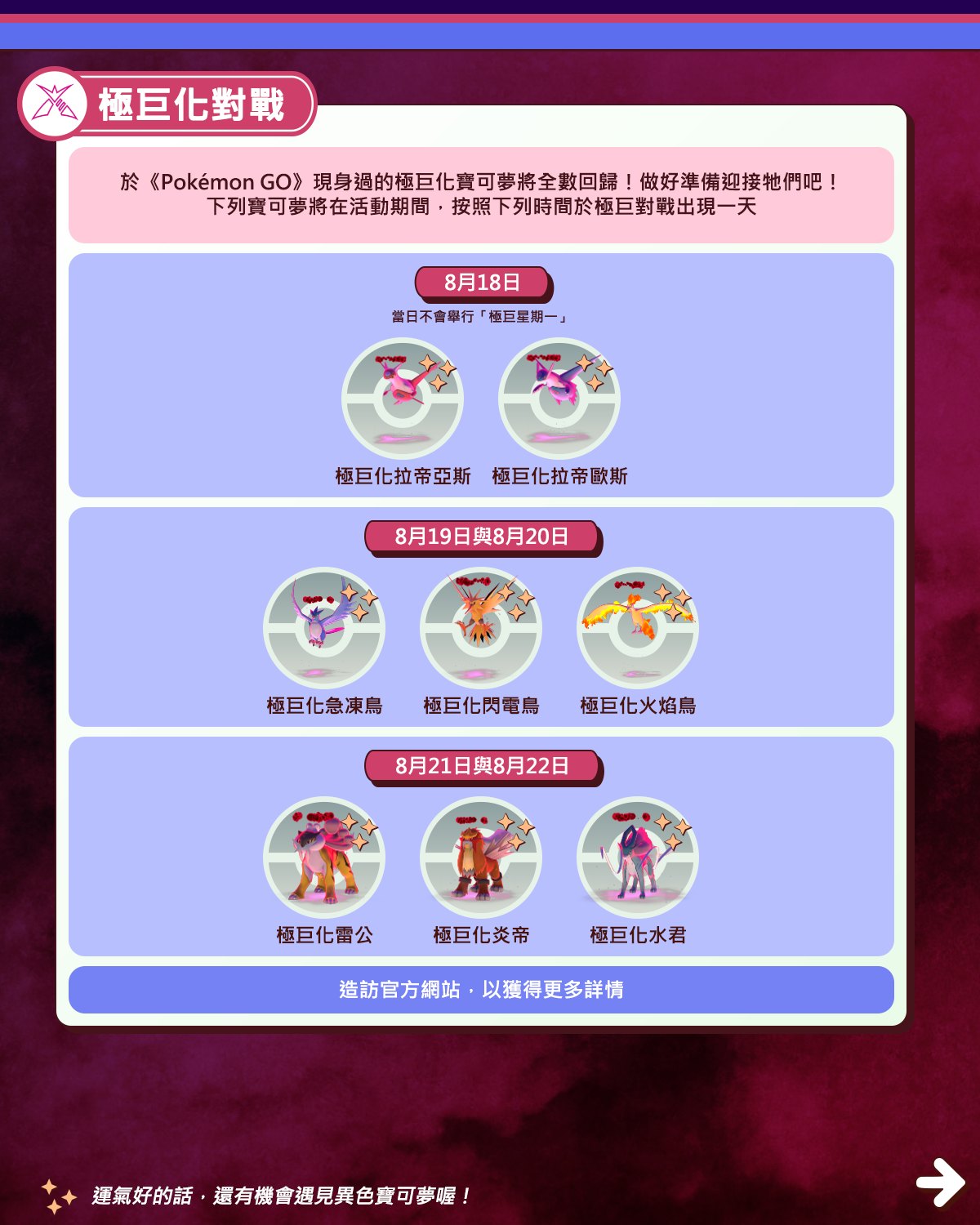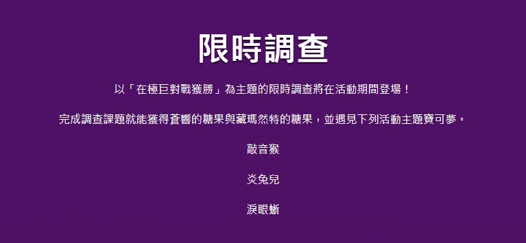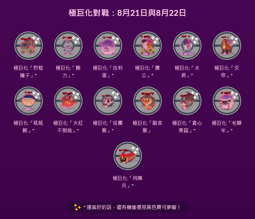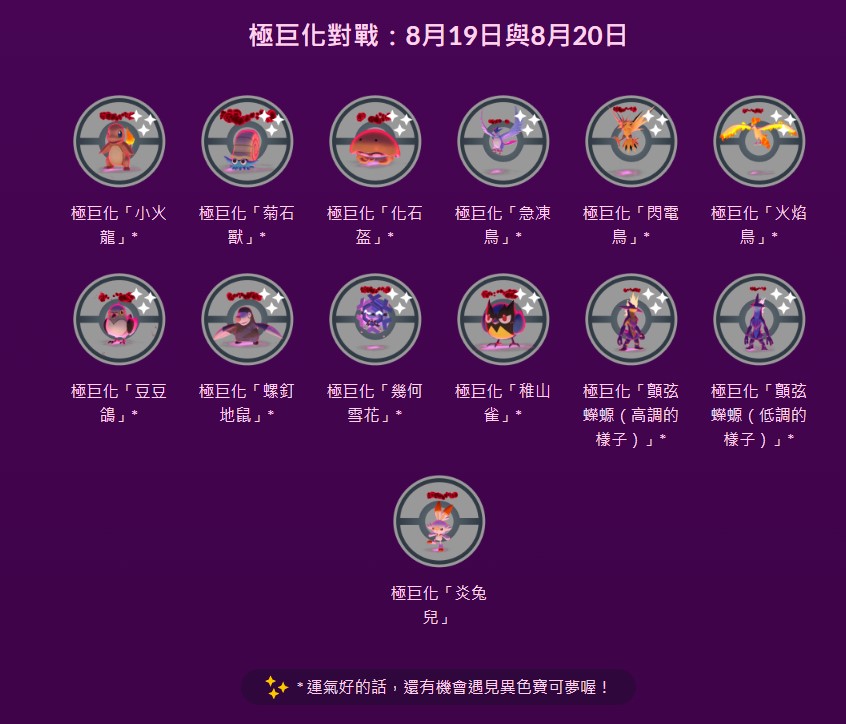 在即將到來的「紫黑之空」活動中捕捉更多極巨化寶可夢,努力增強自己的小隊吧!