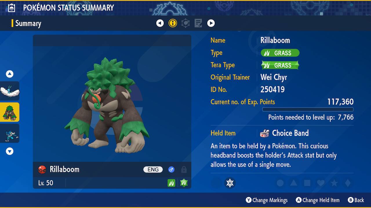 Rillaboom will be level 50 with the moves: Grassy Glide, Wood Hammer, U-turn & High Horsepower. It will be holding a Choice Band