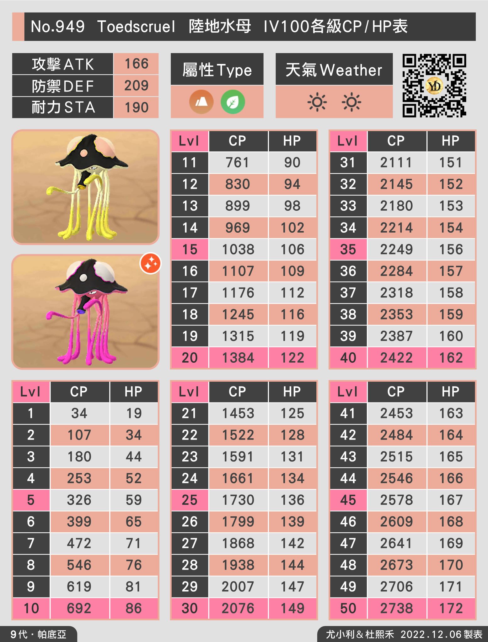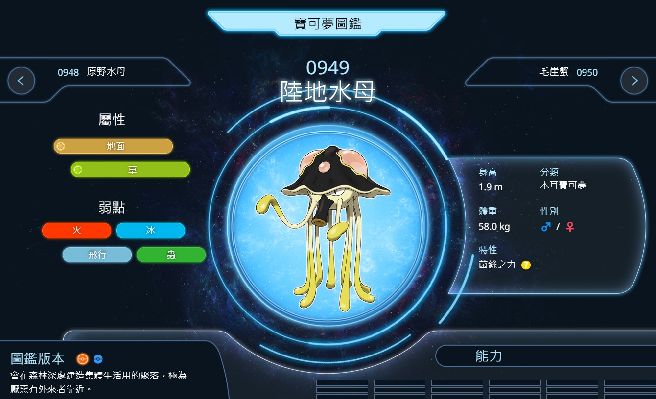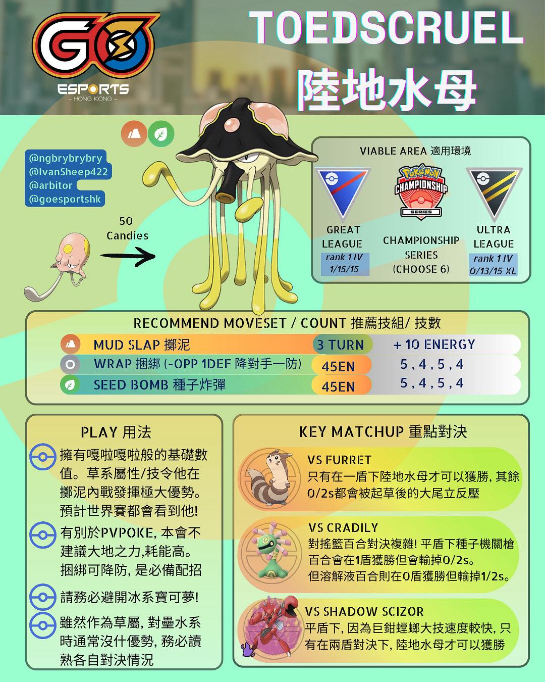 陸地水母在超級聯盟體質2047,而高級聯盟4417,坦度非常高,小招有高傷害的擲泥、正常蓄能的泥巴射擊,大招有大地之力跟種子炸彈,還有降防的緊束和酸液炸彈,可以搭配高傷害小招跟恐怖的坦度拖垮對手,屬性地草代表怕冰雙剋、火飛蟲單剋,好像跟一般草系差不多。