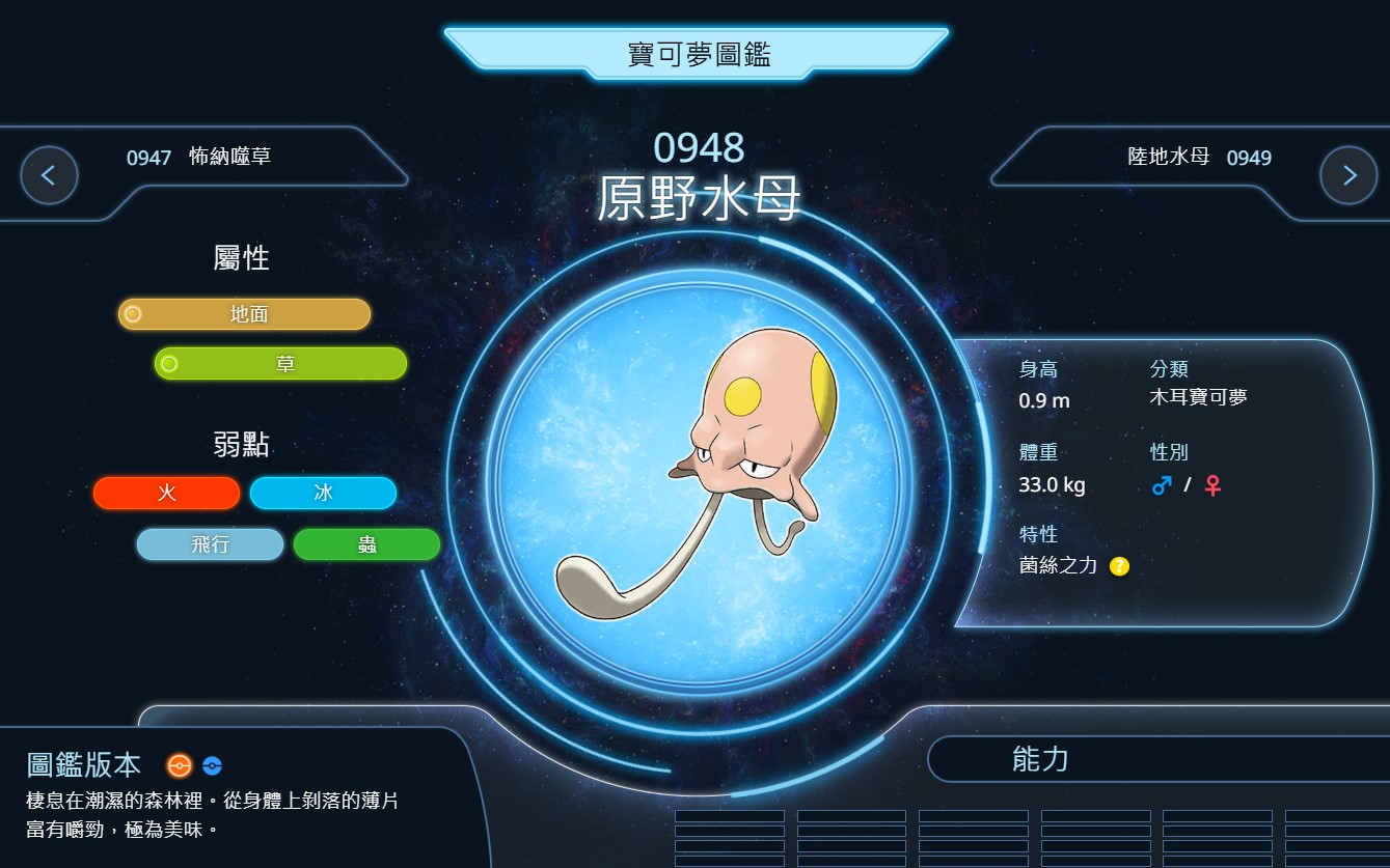 首先是造型喜感的陸地水母,屬性地面+草,分類是木耳寶可夢,來源於木耳的日語:木水母,下方的褶皺也是一道佳餚,不要懷疑,這寶可夢可以吃。