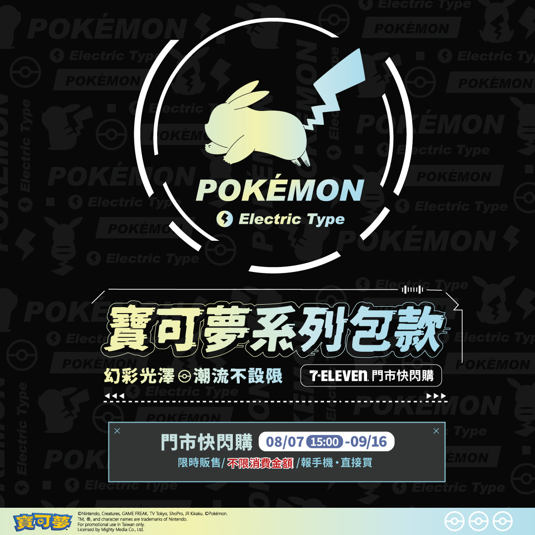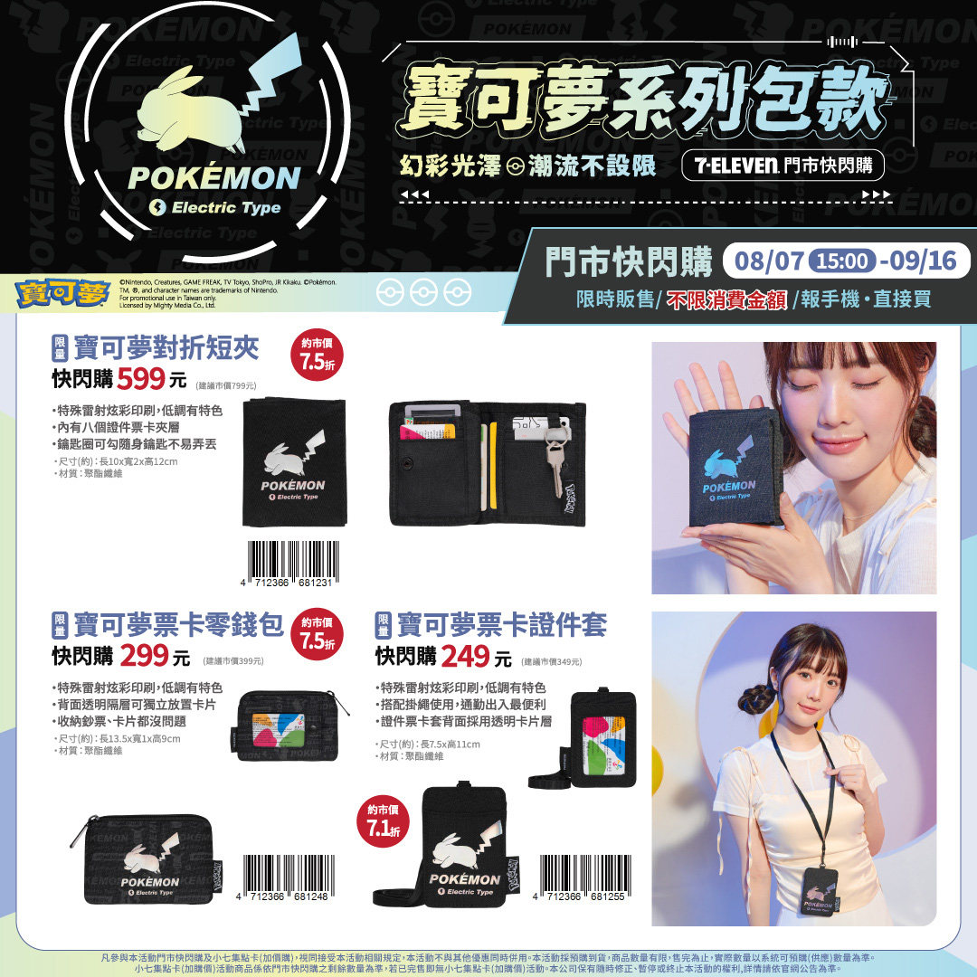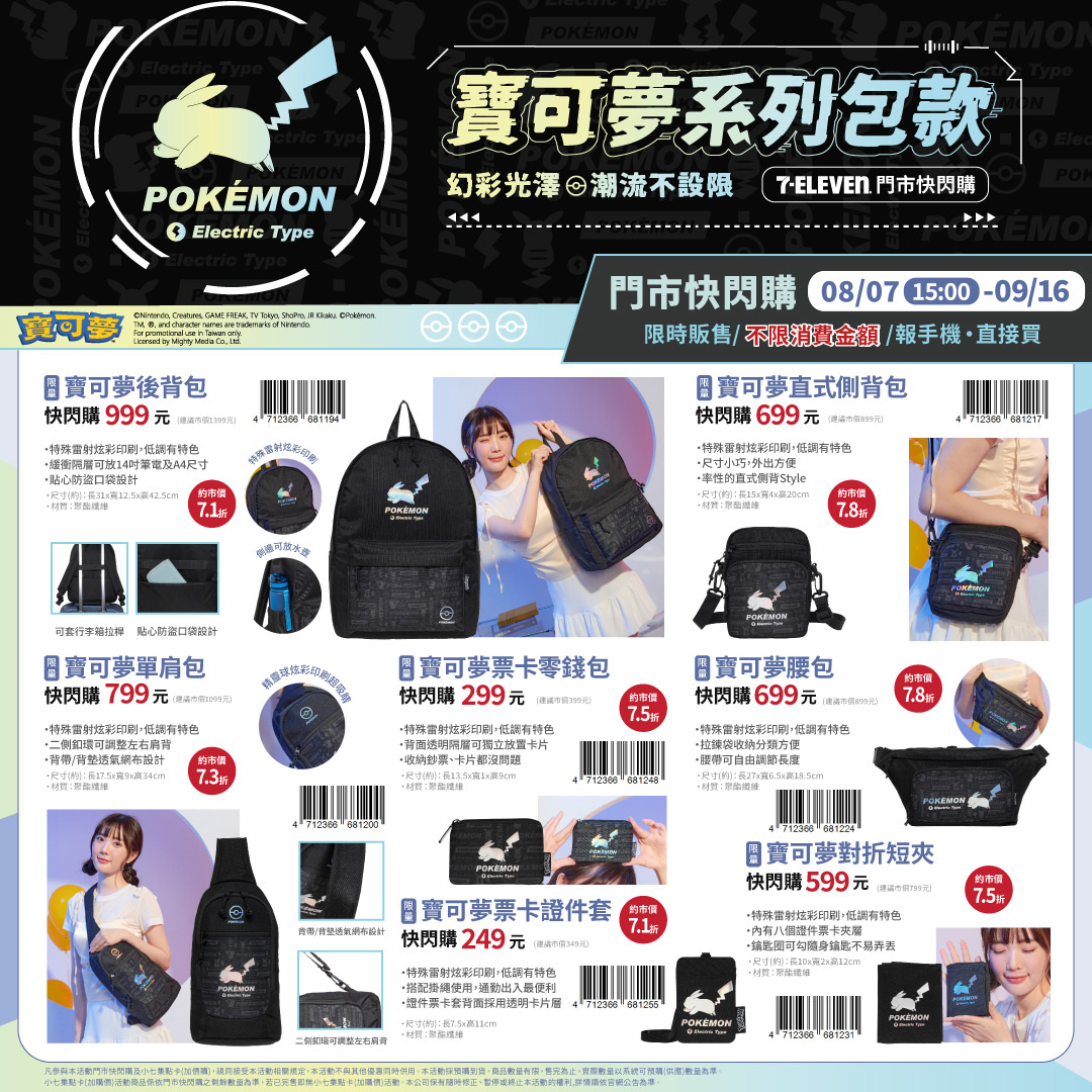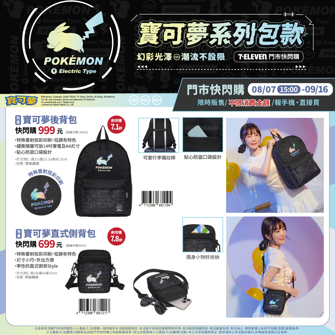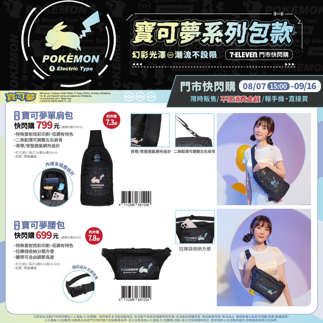 POKÉMON x 7-ELEVEN ALL BLACK 雷射炫彩皮卡丘 寶可夢後背包、單肩包、側背包、腰包、對折短夾、零錢包