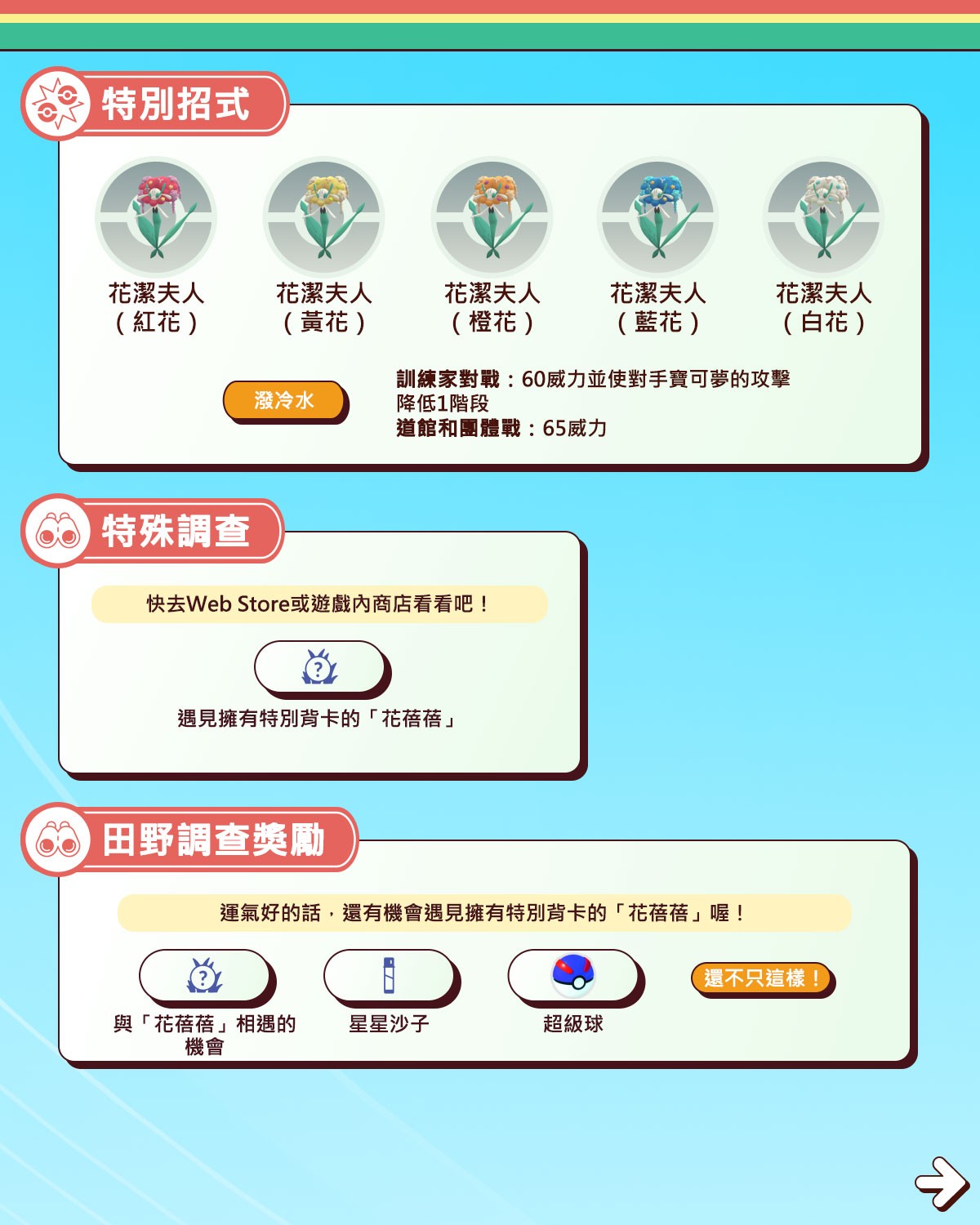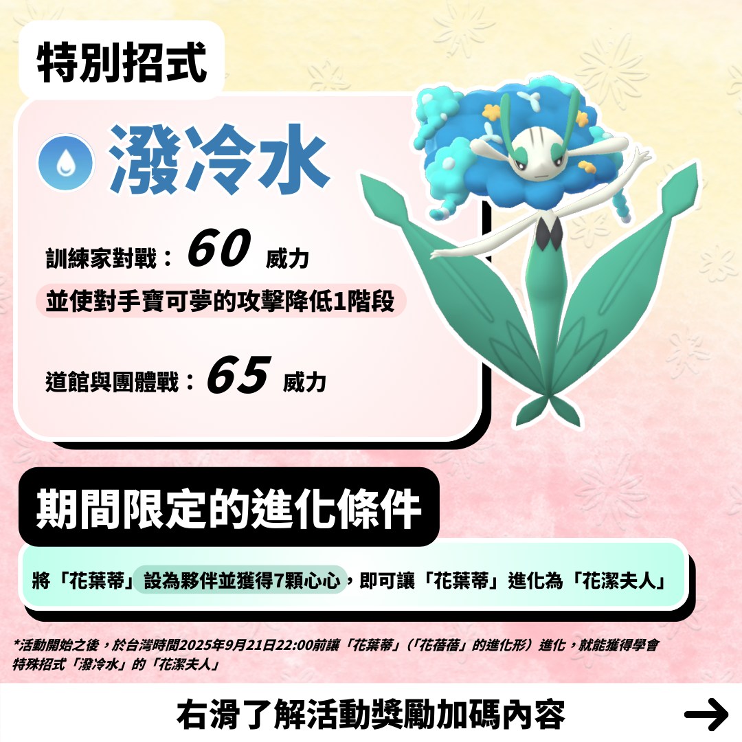 只要在活動開始之後,於台灣時間2025年9月21日22:00前讓「花葉蒂」(「花蓓蓓」的進化形)進化,就能獲得學會特殊招式「潑冷水」的「花潔夫人」。