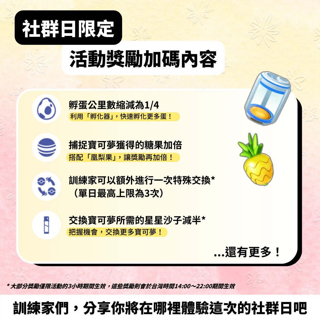 當天有三次特殊交換(當天1次+社群日1次+禮拜日特殊活動1)只有社群日活動的特殊交換晚上10點前要完成其餘2次晚上12點前完成即可