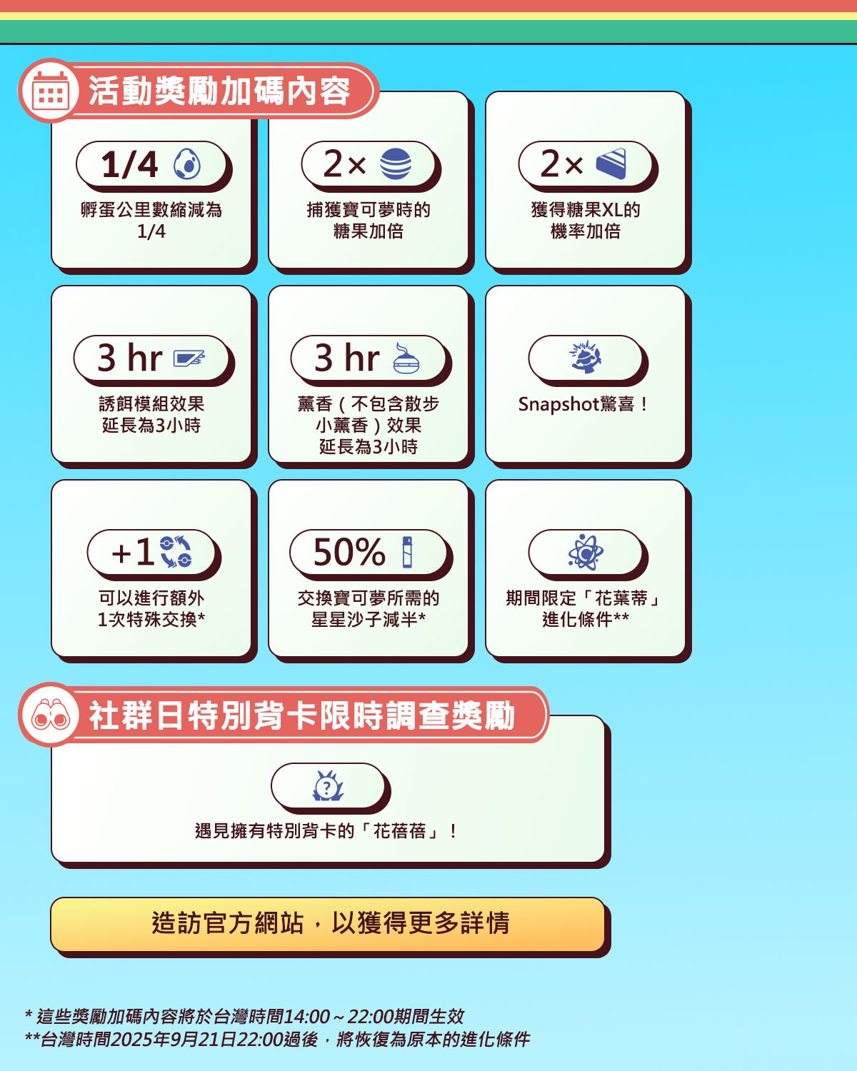 請注意限時調查有時限。訓練家必須在台灣時間2025年9月21日22:00前完成限時調查相關課題並領取獎勵。