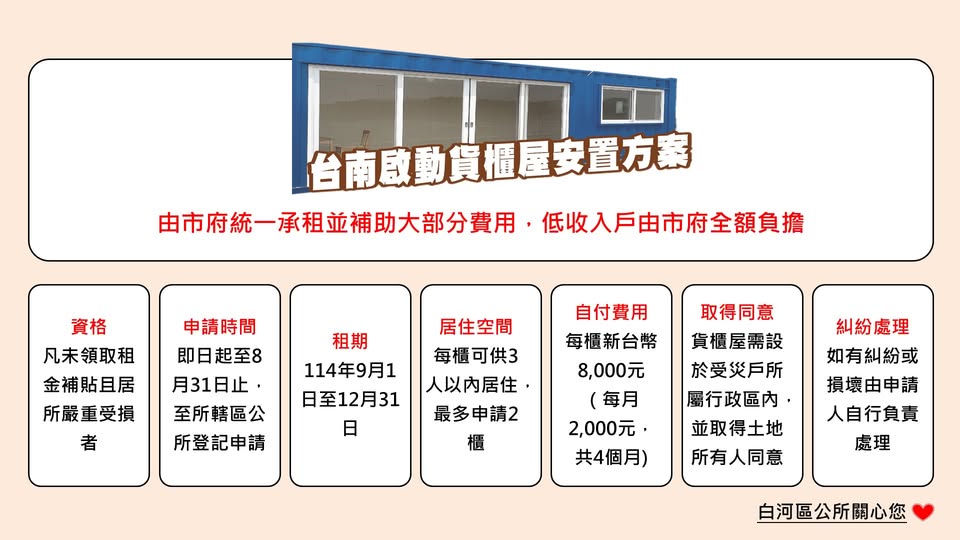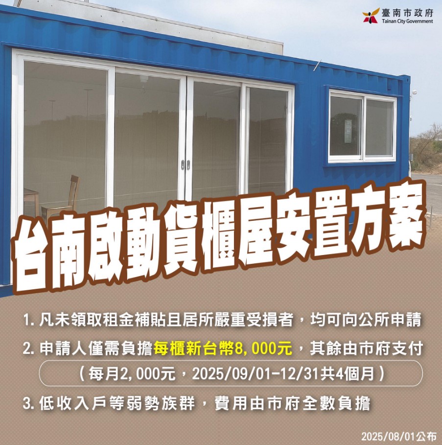 為協助因丹娜絲颱風造成住家毀損、無法居住的災民,臺南市政府推出「114年丹娜絲風災災民租用貨櫃屋計畫」,自即日起至8月31日止,開放至所轄區公所登記申請。