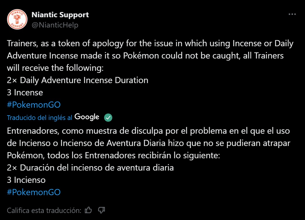 🤓Trainers, debido a un error en el Incienso ocurrido hace una semana, en el cual no se podían atrapar Pokémon mientras estaba activado, Niantic ha decidido otorgar la siguiente compensación en Pokémon GO.