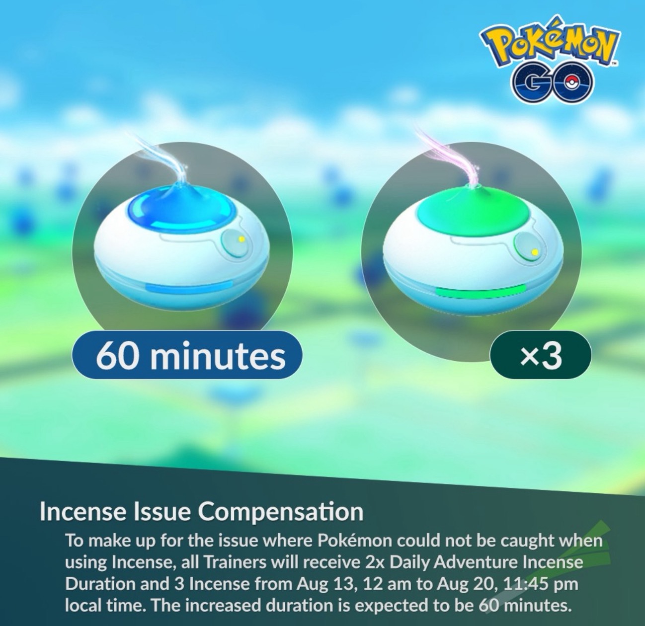 all Trainers will receive 2x Daily Adventure Incense Duration and 3 Incense from August 13, at 12 am to August 20, 2025, at 11:45 pm local time.