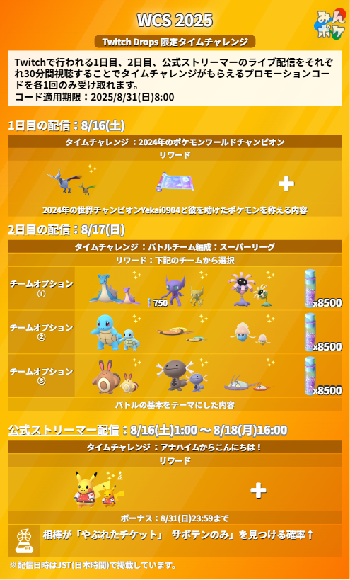 訓練家只要在台灣時間2025年8月16日00:00~2025年8月18日15:00期間,收看任一《Pokémon GO》Twitch官方合作實況頻道,即可領取1組獨家限時調查的兌換代碼。