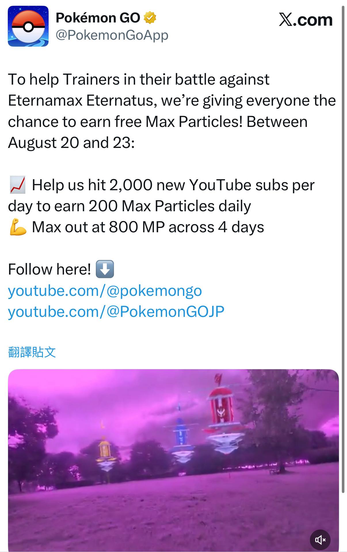 Pokemon Go官方公佈,由8月20日至8月23日期間,