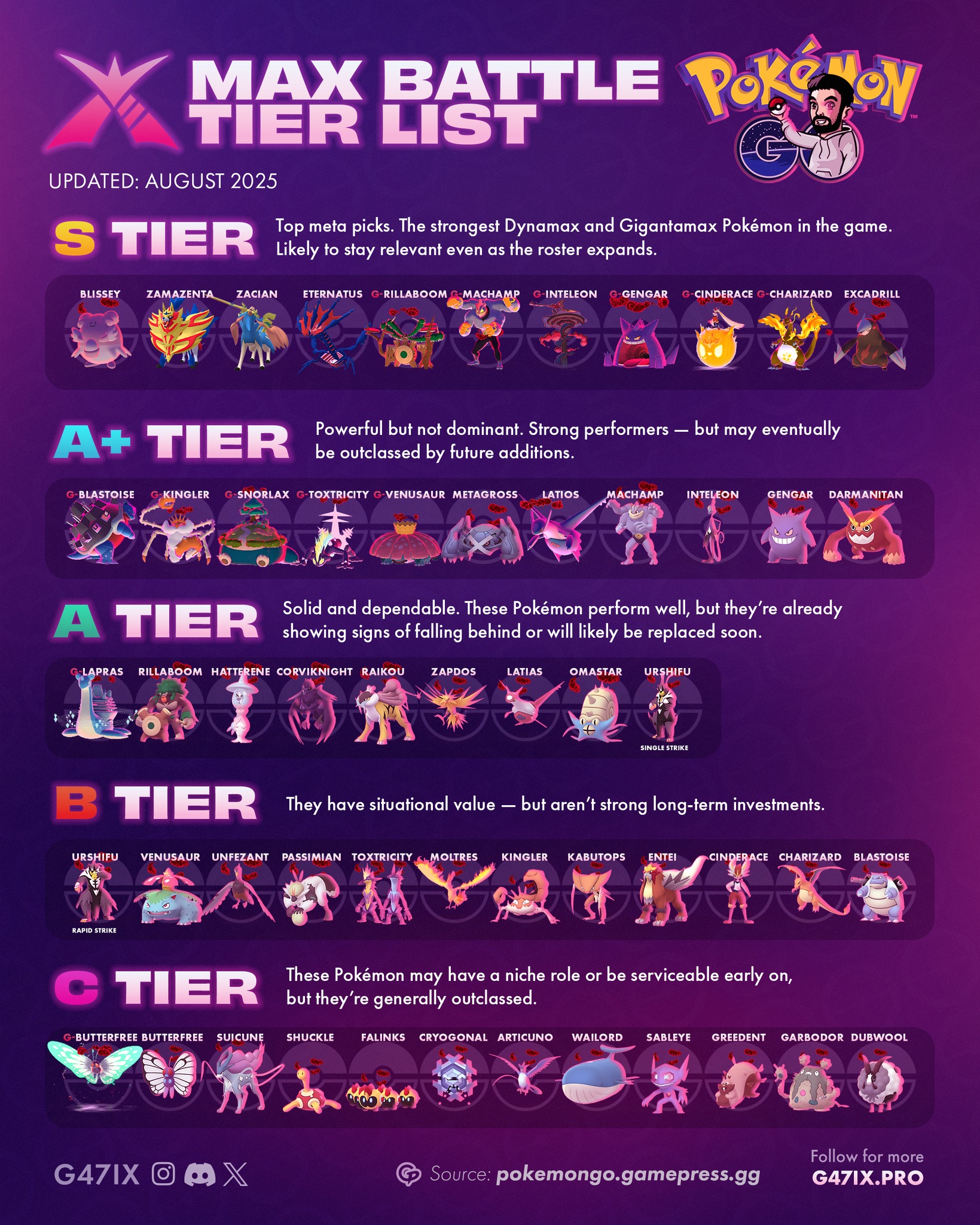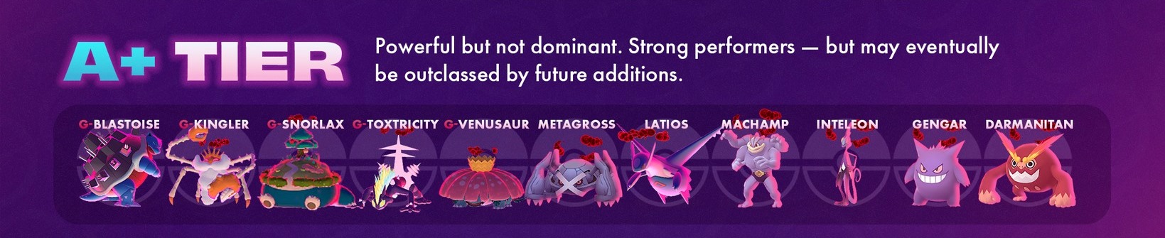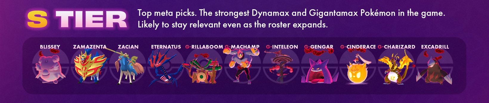 頂級meta選擇。遊戲中最強的極巨化與超極巨化寶可夢。即使未來新增更多寶可夢,牠們很可能依然是主流選擇。