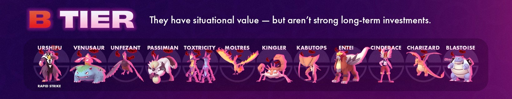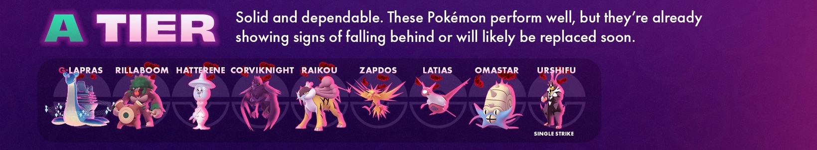 穩定且可靠。這些寶可夢表現不錯,但已開始顯露疲態,或很快會被取代。