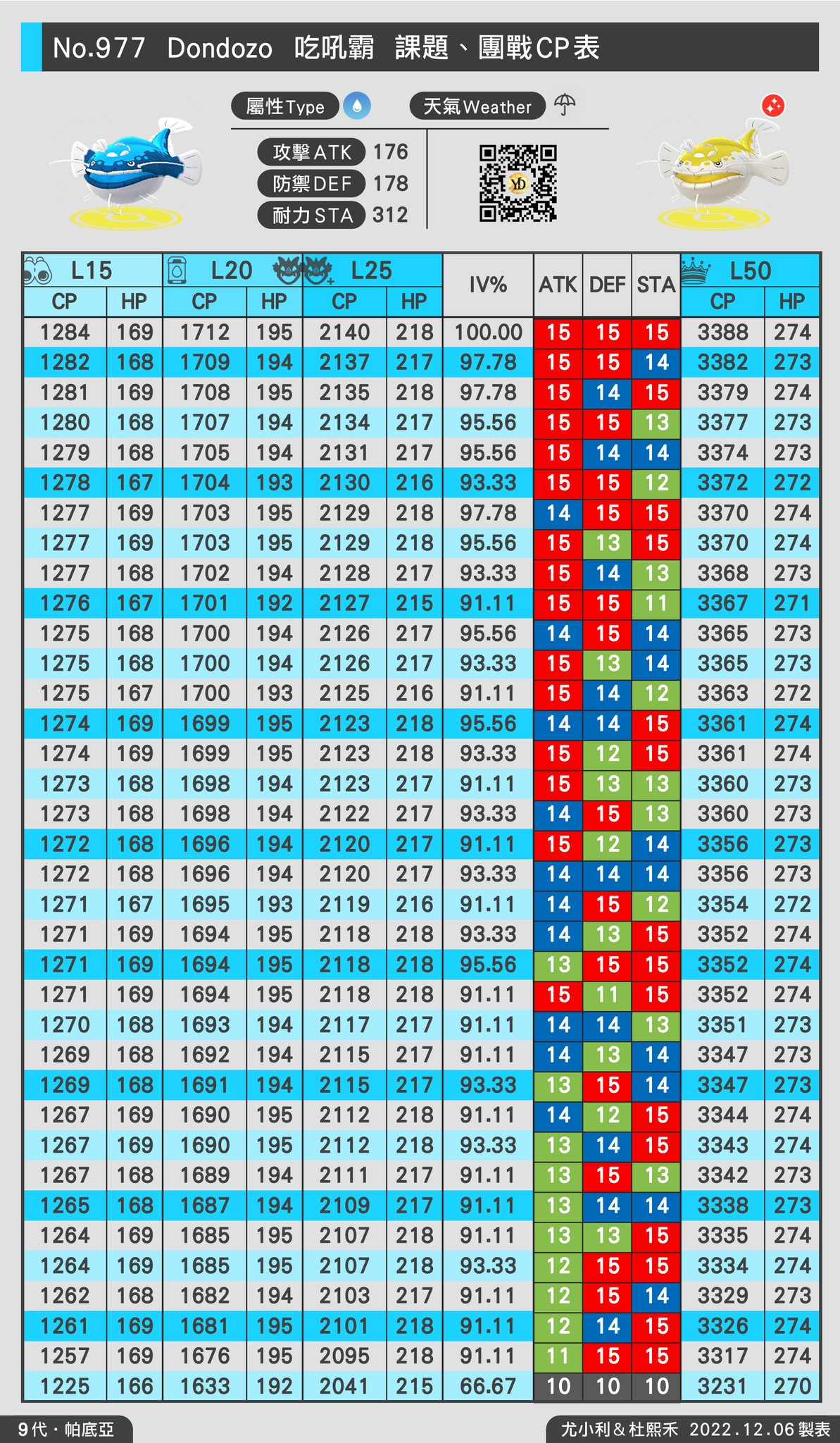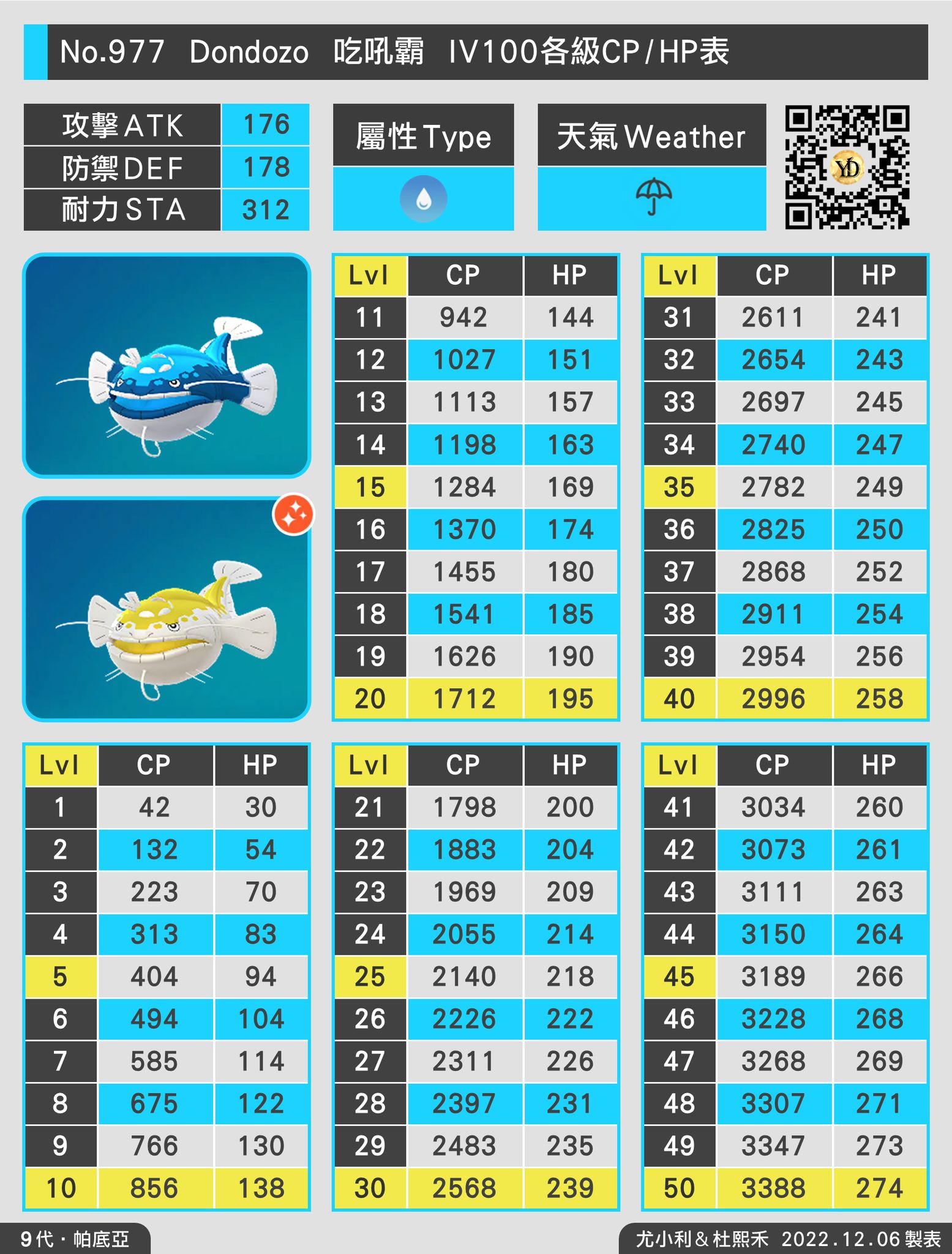 IV 值為 100% (15/15/15) 的「吃吼霸」在各等級對應的 CP (戰鬥力) 表。