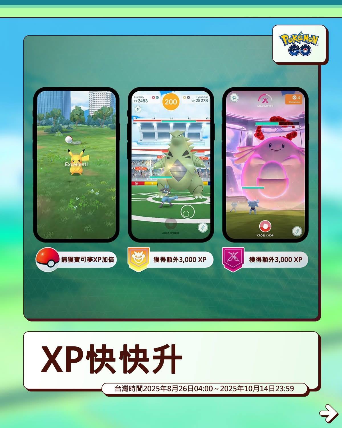 台灣時間2025年8月26日04:00~2025年10月14日23:59期間,所有訓練家將享有以下獎勵加碼內容,且能夠與其他活動的獎勵加碼內容效果疊加!