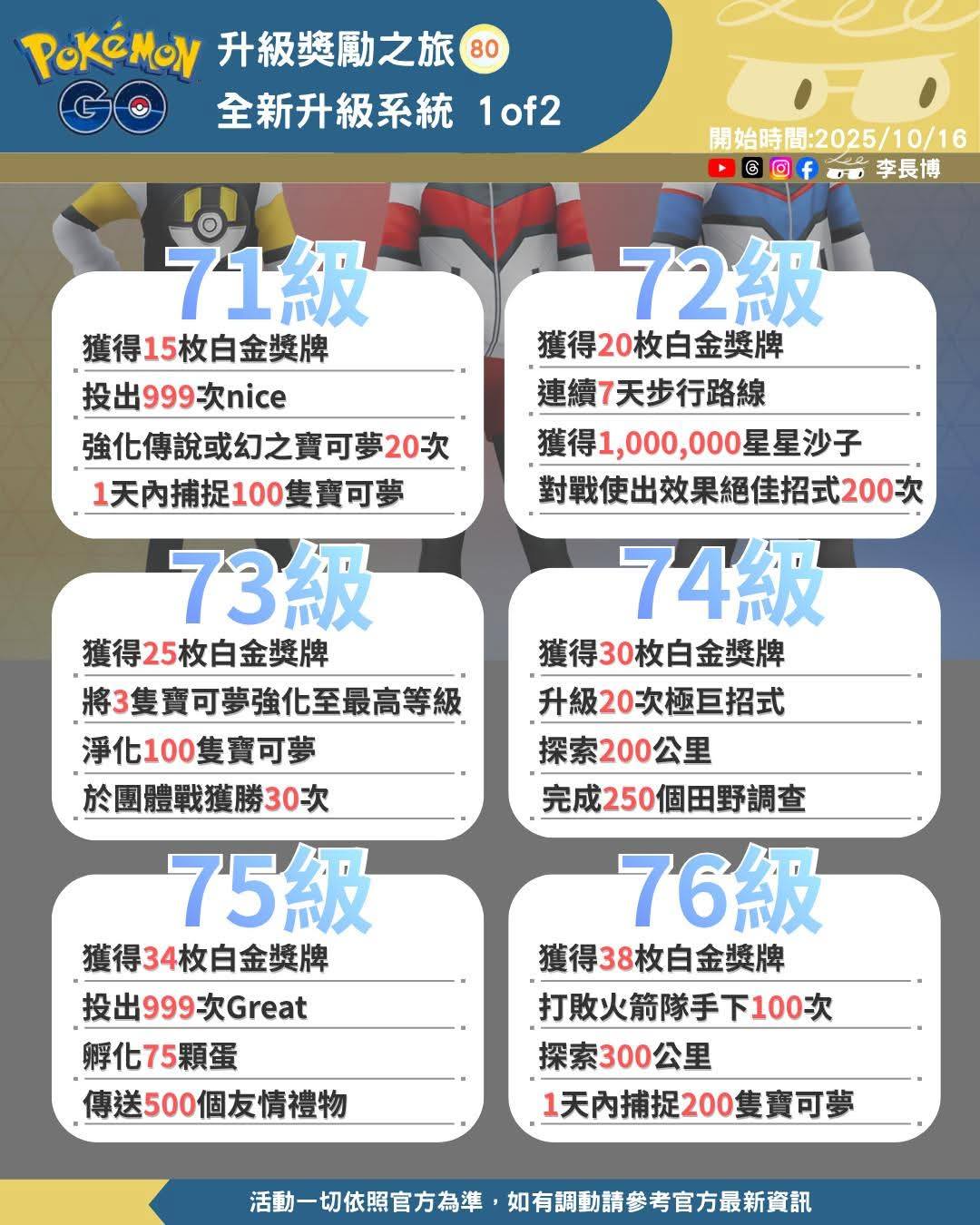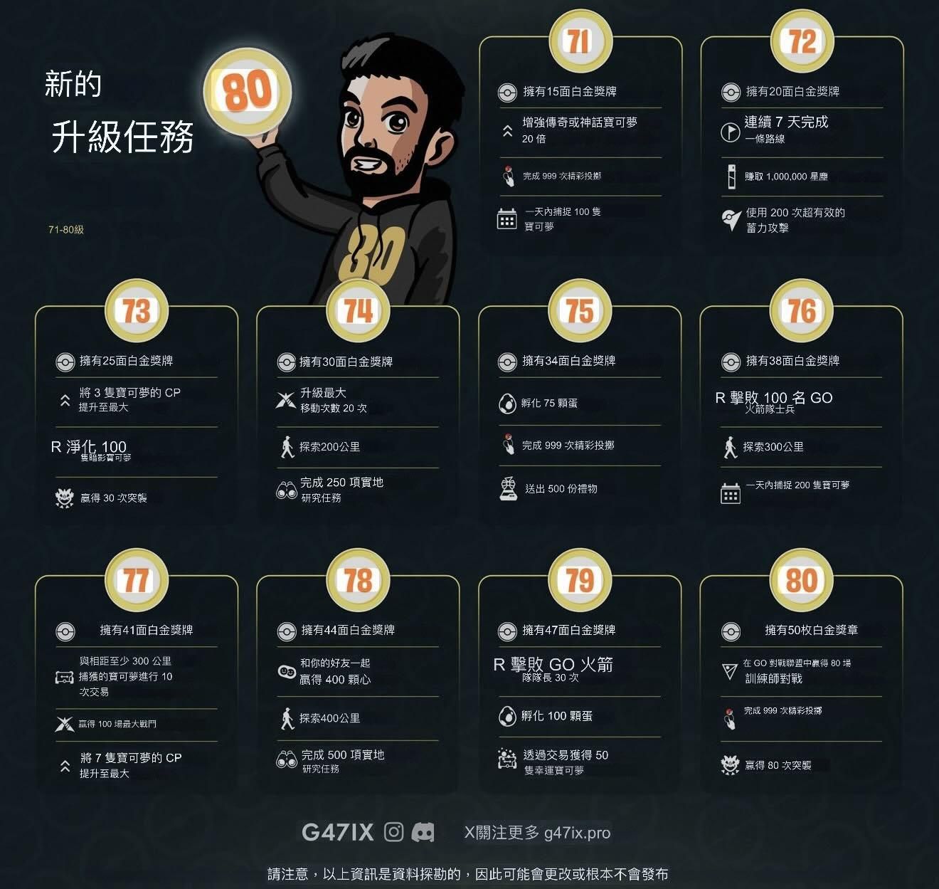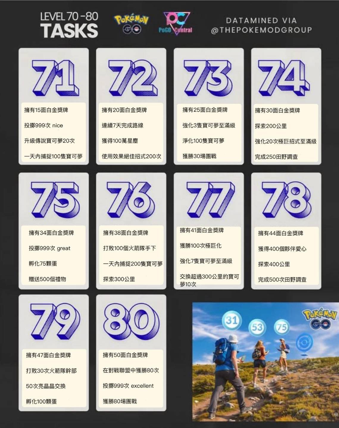 訓練家將需獲得一定數目的XP,並分別完成各個等級的全新「升級調查課題」,才能在等級71至等級80之間升級。*