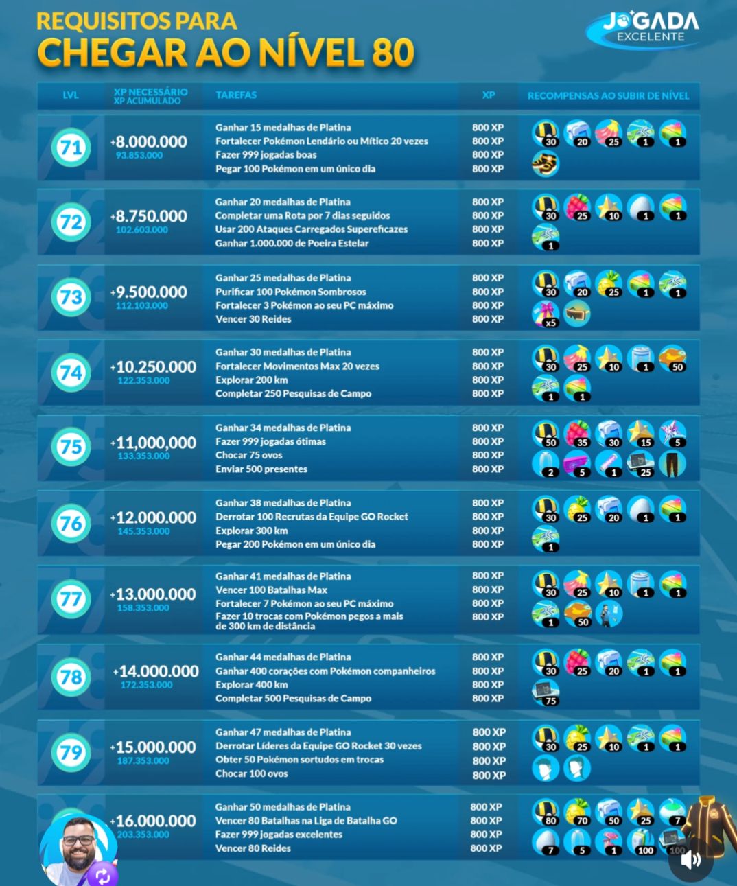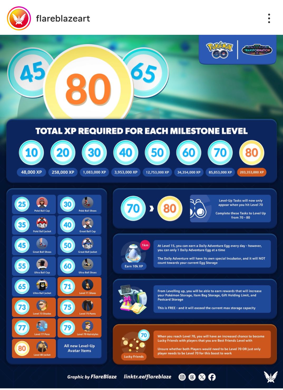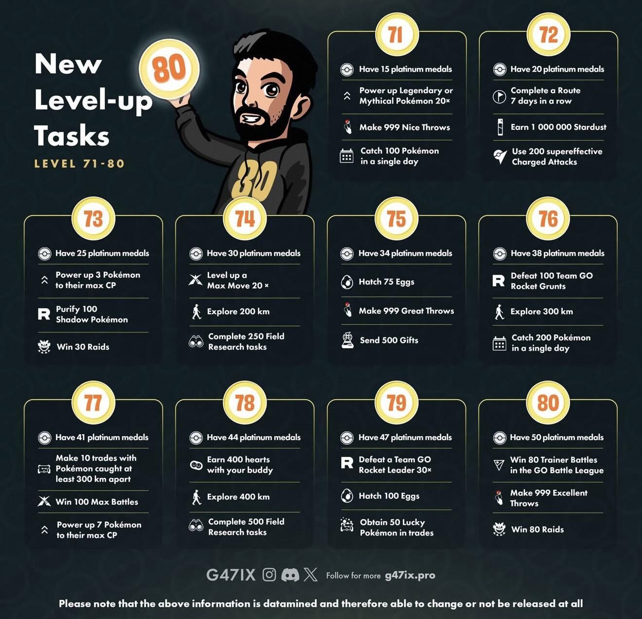 訓練家將需獲得一定數目的XP,並分別完成各個等級的全新「升級調查課題」,才能在等級71至等級80之間升級。*