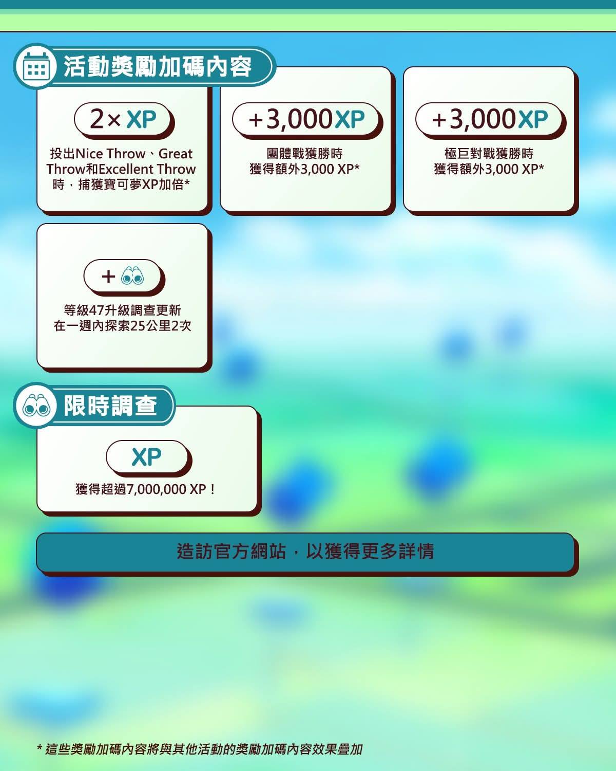 此外,等級5以上的訓練家皆可參與本次活動的限時調查,完成調查即可獲得超過7,000,000 XP!