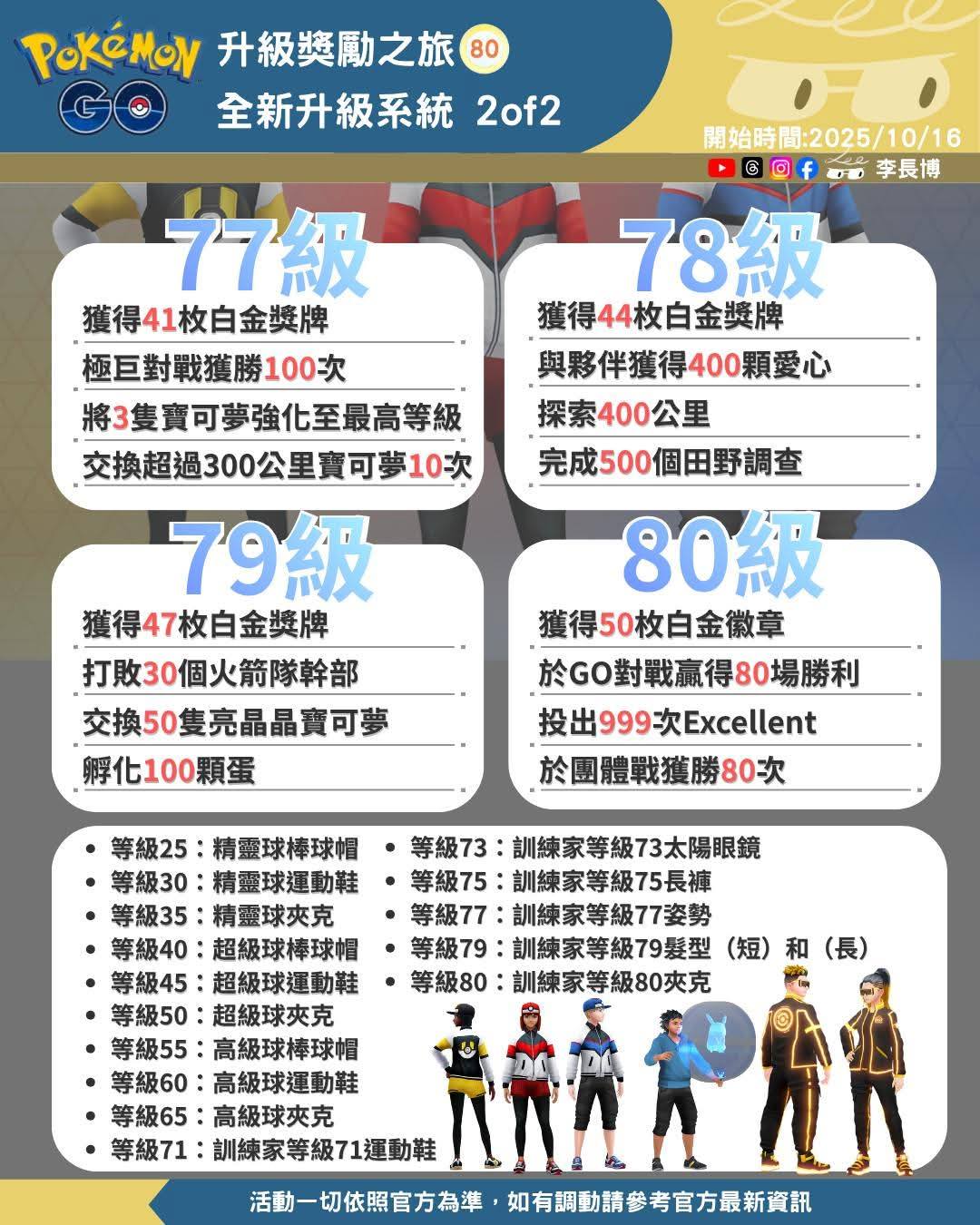 訓練家等級上限將自等級50提高至等級80。* 升級系統即將迎來新的平衡改動,讓訓練家能夠加快提升等級的速度,並從中獲得更多獎勵。