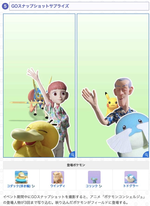 笑一個!只要在活動期間拍攝Snapshot,就有機會遇見《寶可夢禮賓部》裡出現的寶可夢與角色喔!