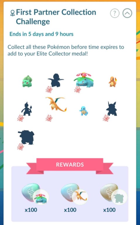 【捕捉】捕捉5隻妙蛙種子、小火龍或傑尼龜 獎勵: 遭遇妙蛙種子、小火龍或傑尼龜的機會  CP 477 (妙蛙種子), CP 420 (小火龍), CP 405 (傑尼龜)