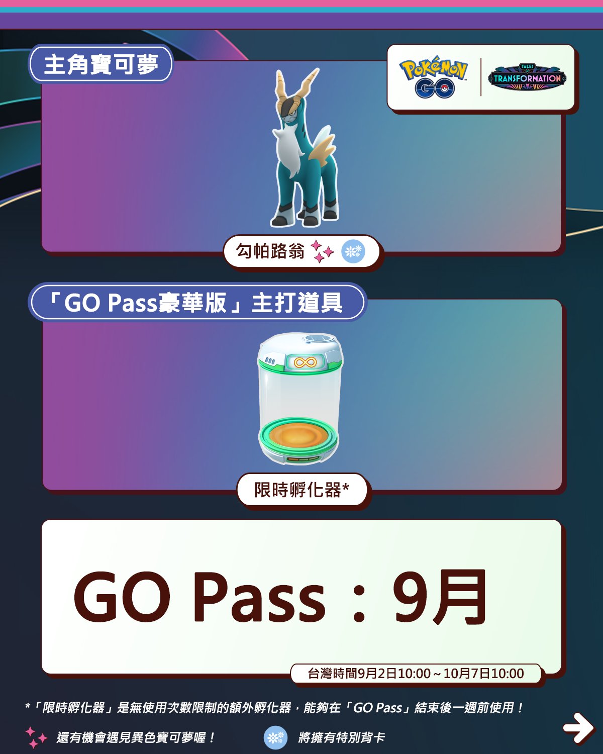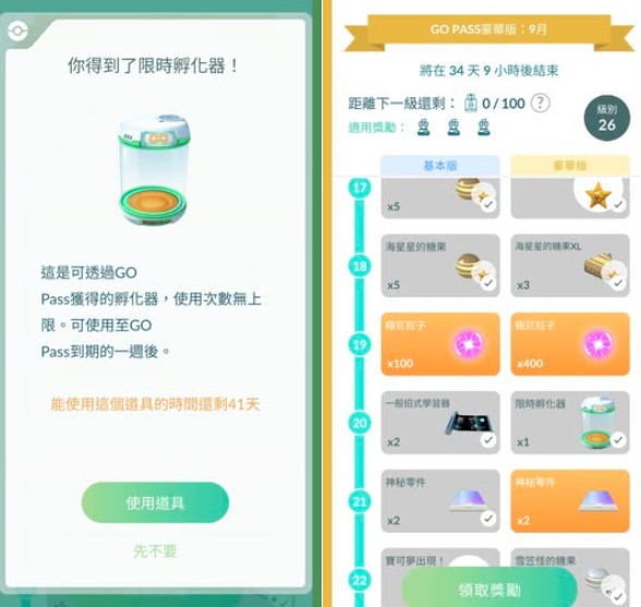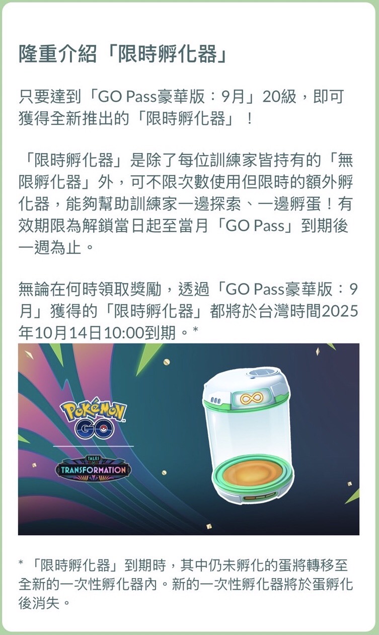 無論在何時領取獎勵,透過「GO Pass豪華版:9月」獲得的「限時孵化器」都將於台灣時間2025年10月14日10:00到期。*