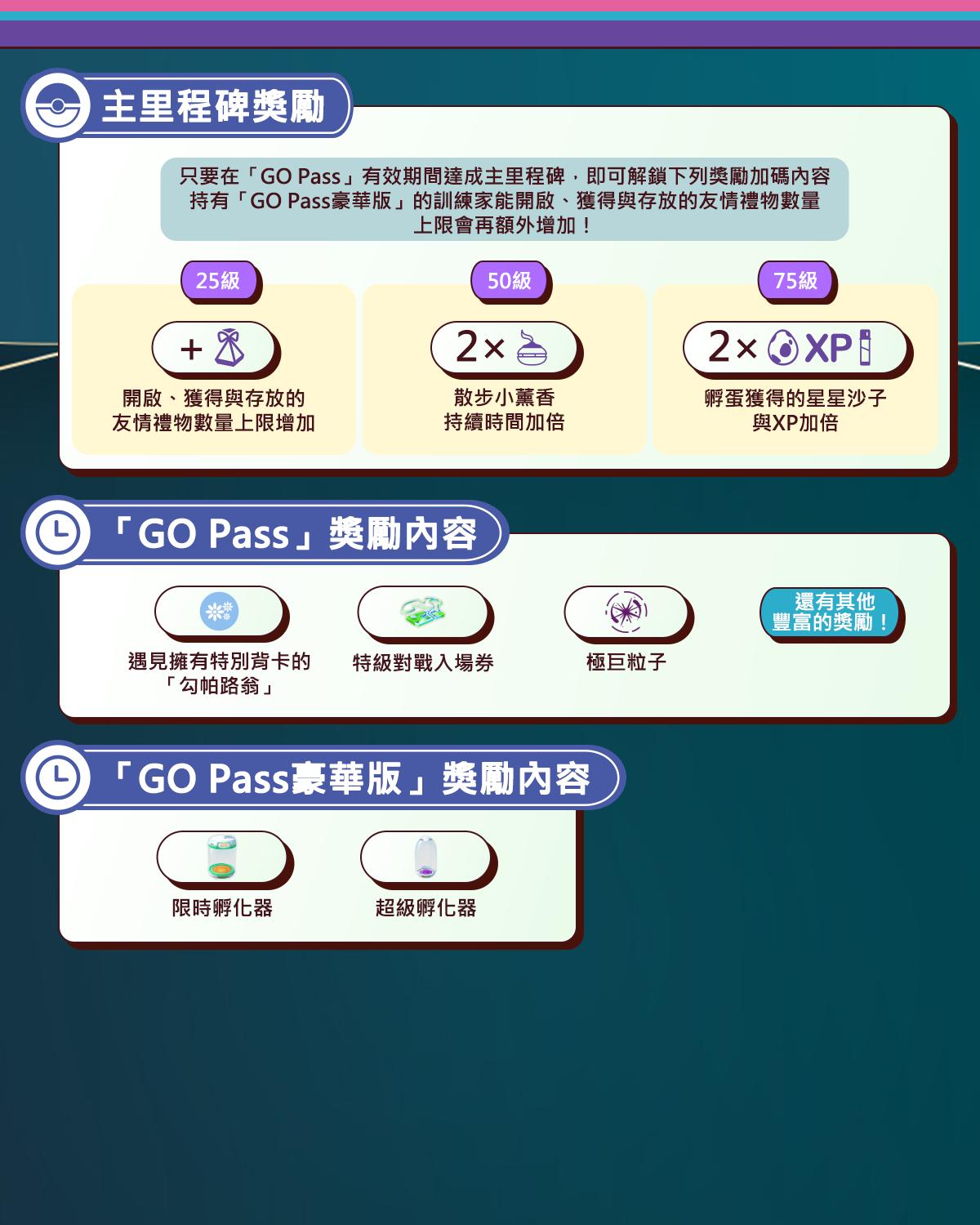 持有「GO Pass豪華版」的訓練家可以額外解鎖下列獎勵: