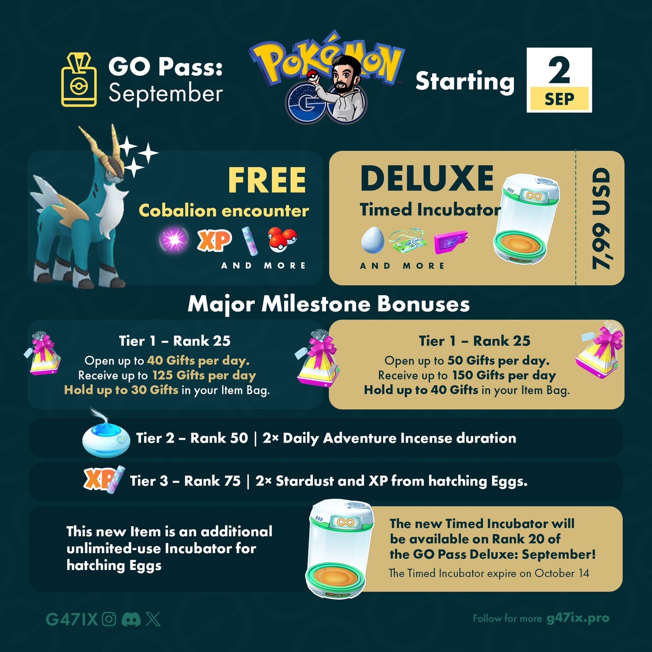 訓練家會在台灣時間9月2日10:00起獲得系統發放的免費「GO Pass:9月」,並且能夠在台灣時間10月7日10:00前累積「GO點數」、提升級別來獲取額外的獎勵內容。