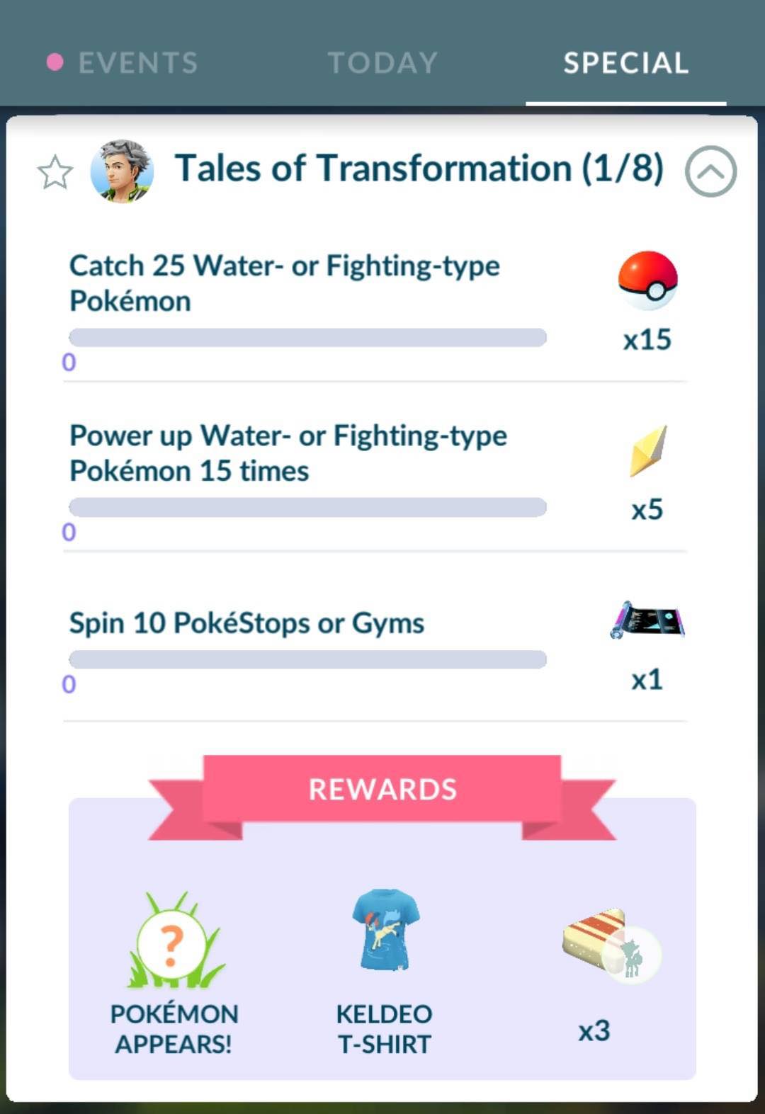 Power up Water or Fighting Type Pokémon 15 Times: 5 Revives Spin 10 PokéStops or Gym: 1 Charged TM