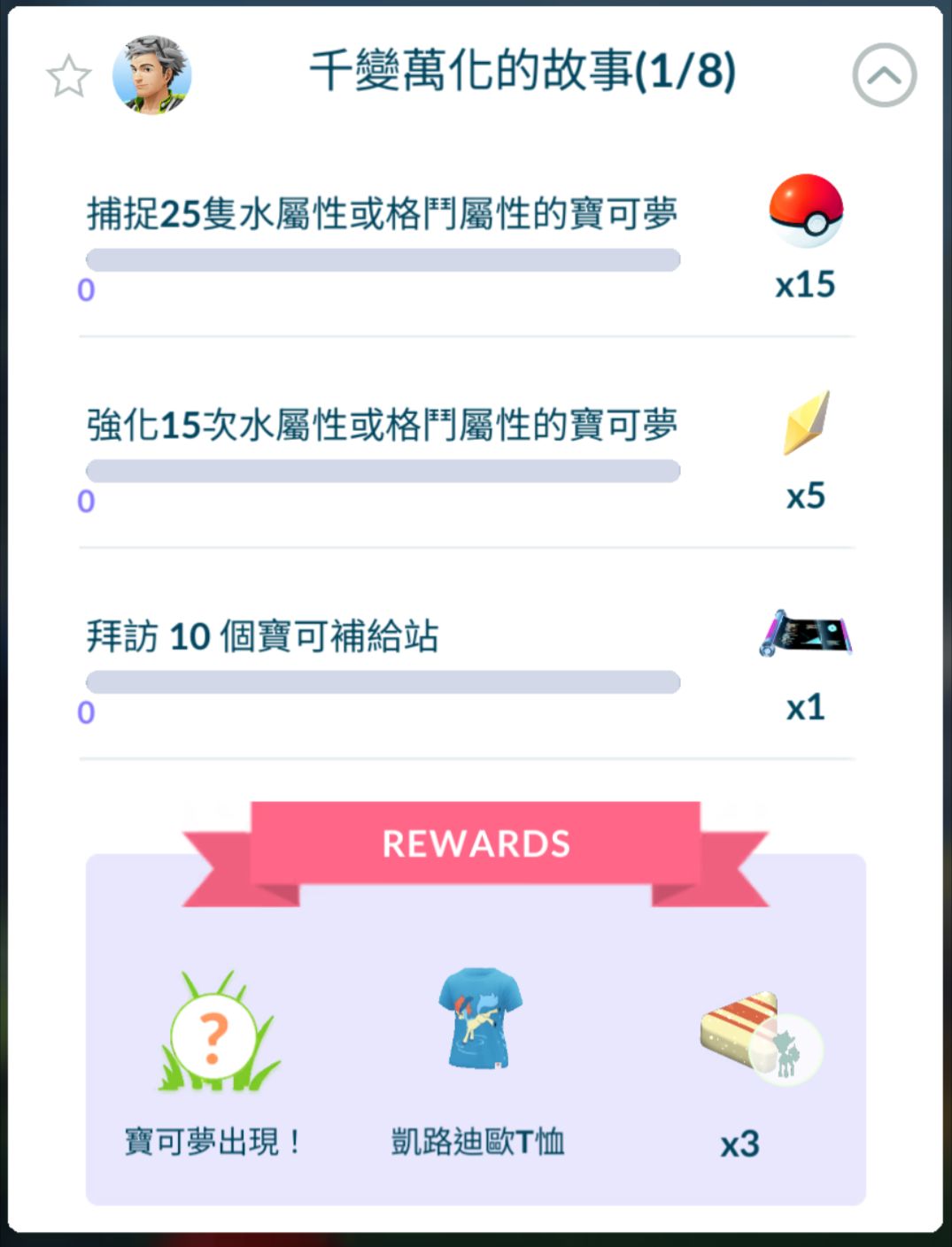 捕捉25隻水屬性或格鬥屬性的寶可夢:15顆精靈球