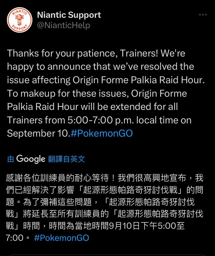 官方加開起源帕路奇亞在9/10的17:00-19:00。