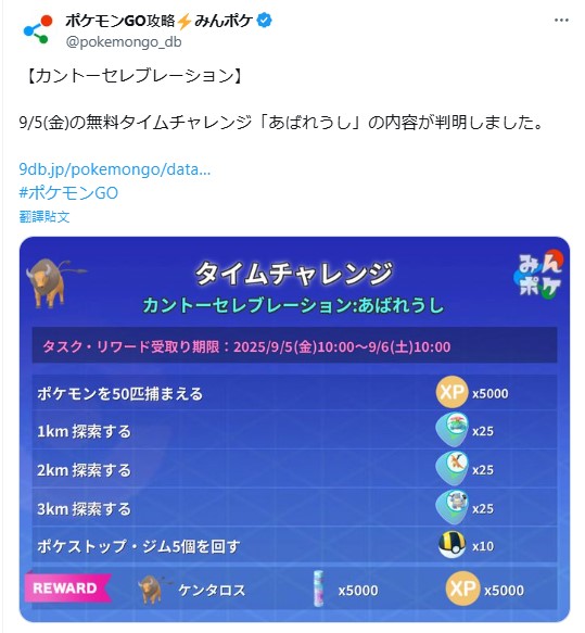 09/05 關都慶典:暴牛限時調查任務獎勵 肯泰羅 Pokemon GO 2025