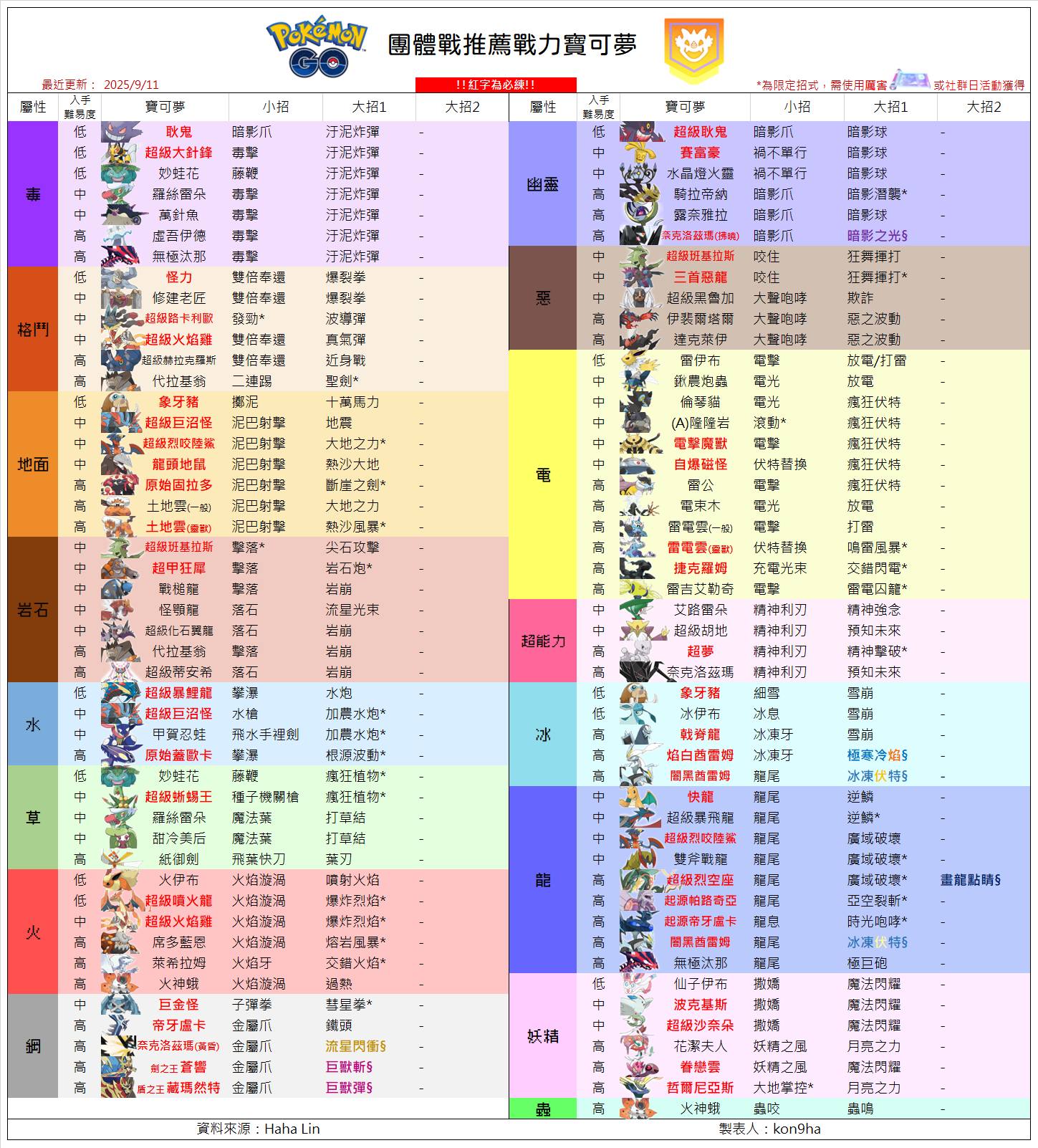 09/12 寶可夢GO推薦各屬性必練名單 PVE團戰各屬性戰力名單 Pokemon GO 2025