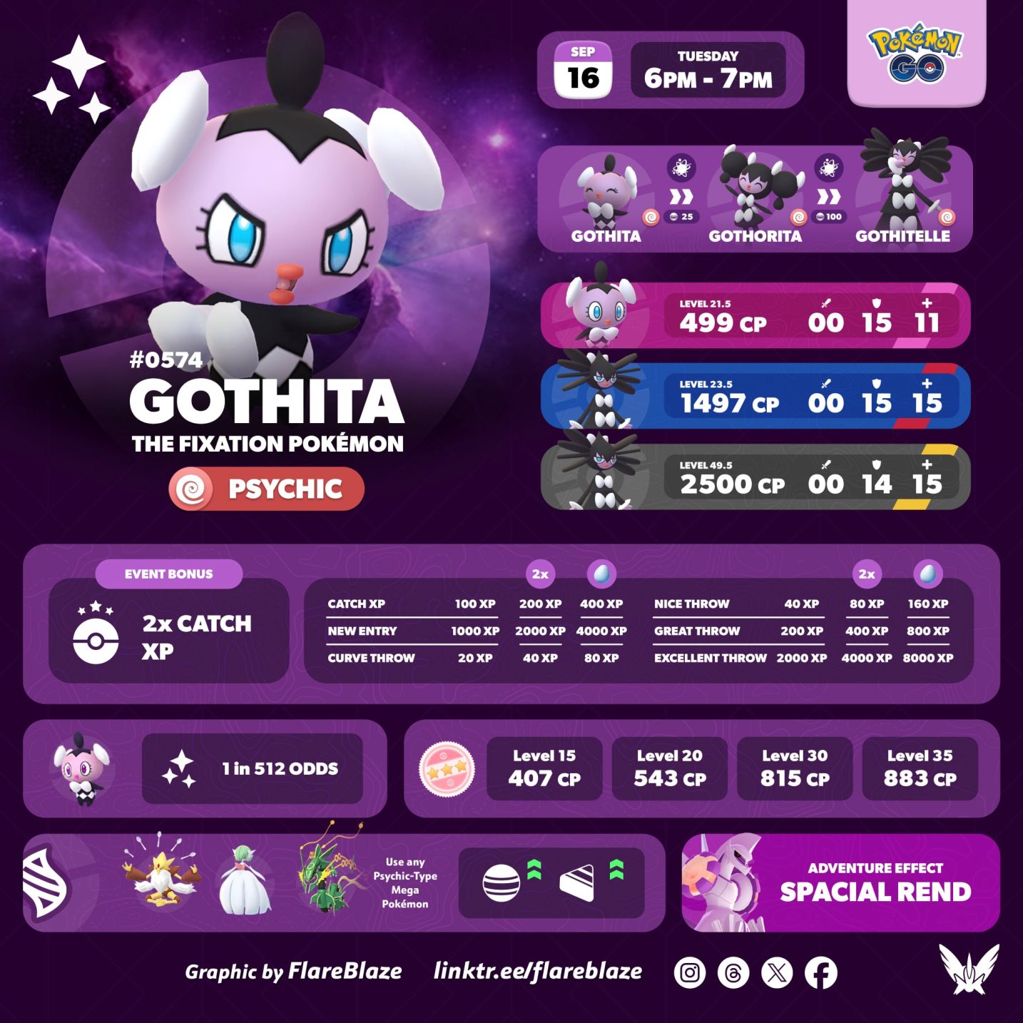 ➡️ El Pokémon #Gothita será el pokémon destacado con el doble de PX por captura