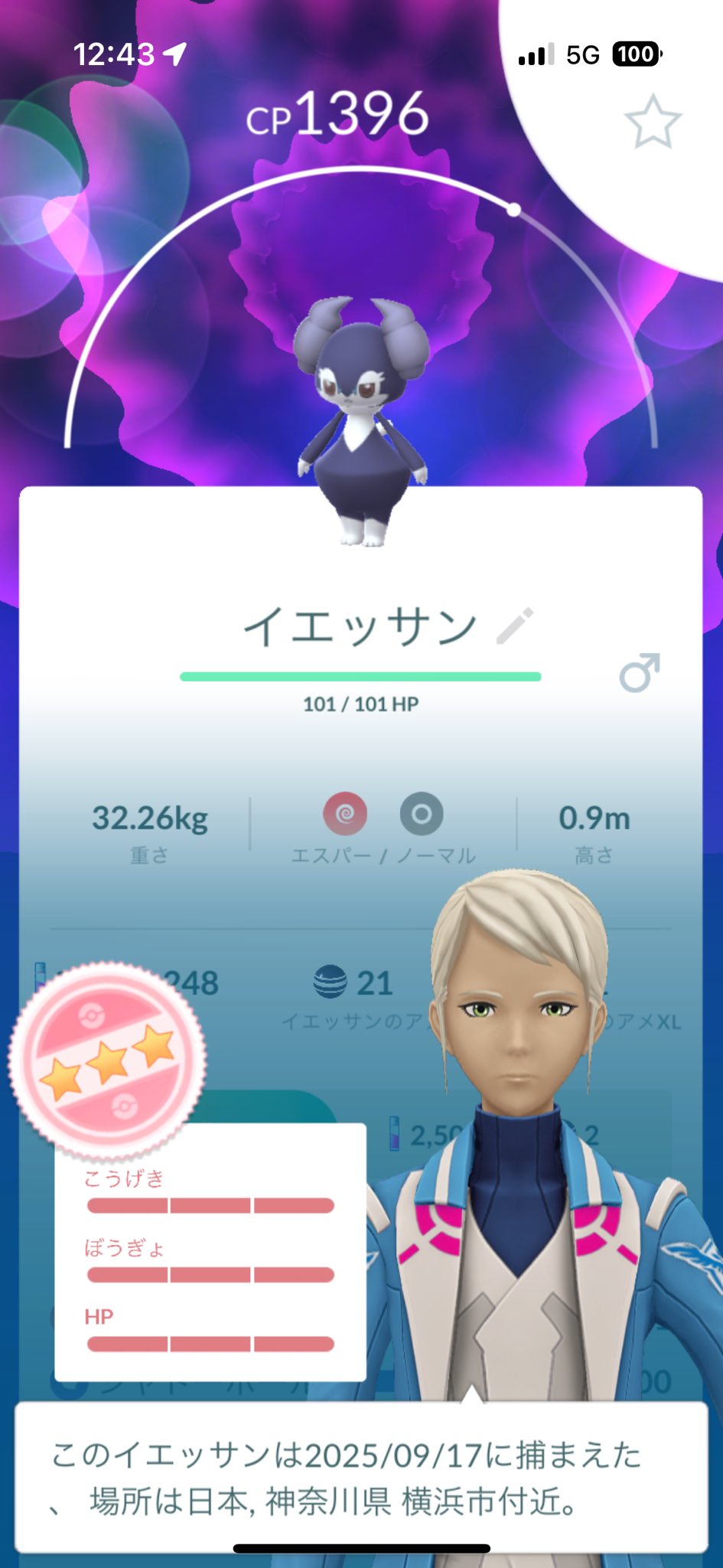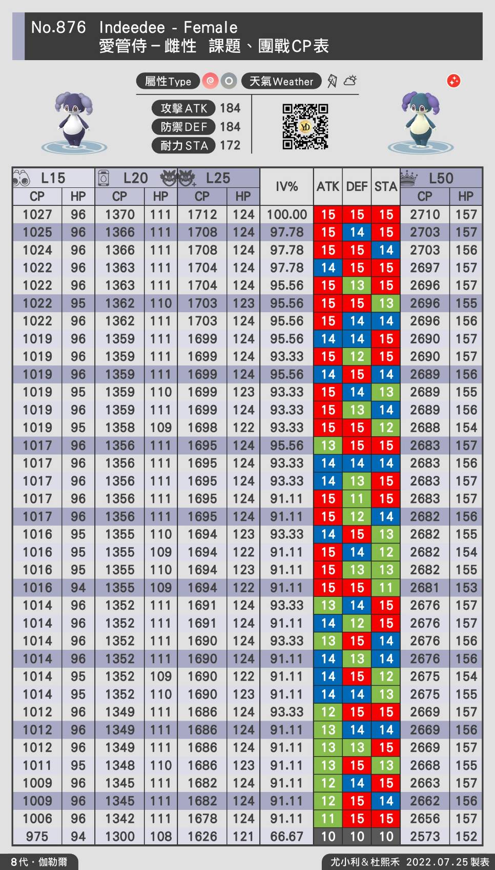 雌 等級21.5 – 25.5 最佳IV組合(Rank 1) Lvl 24 0/12/13 CP 1500