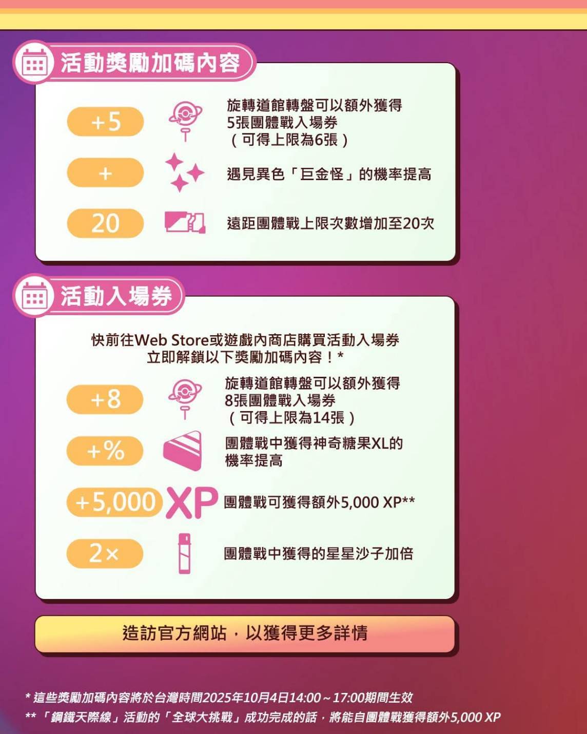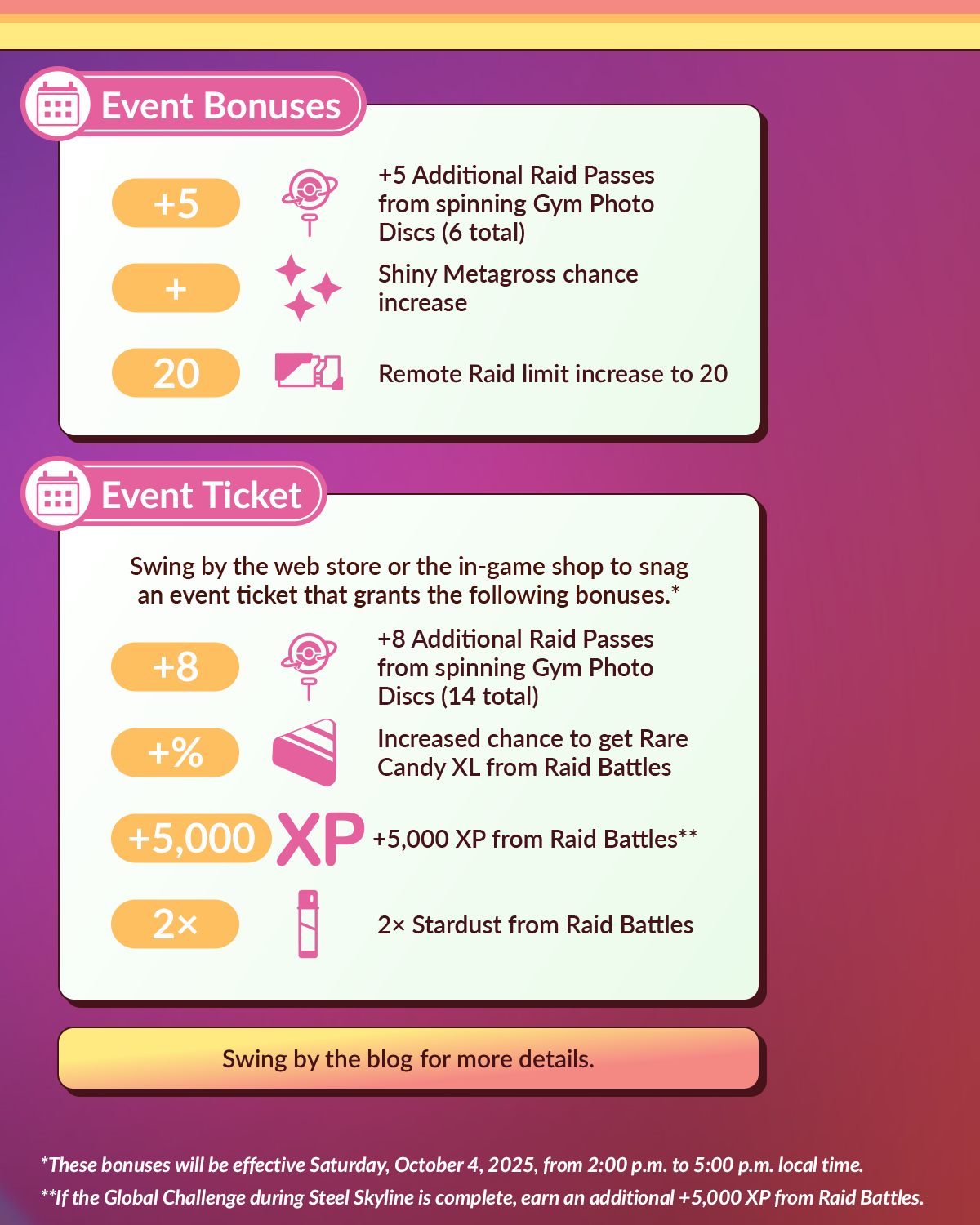 * 「鋼鐵天際線」活動的「全球大挑戰」成功完成的話,持有「超級巨金怪團體戰日」活動入場券的訓練家將能自團體戰獲得額外5,000 XP。