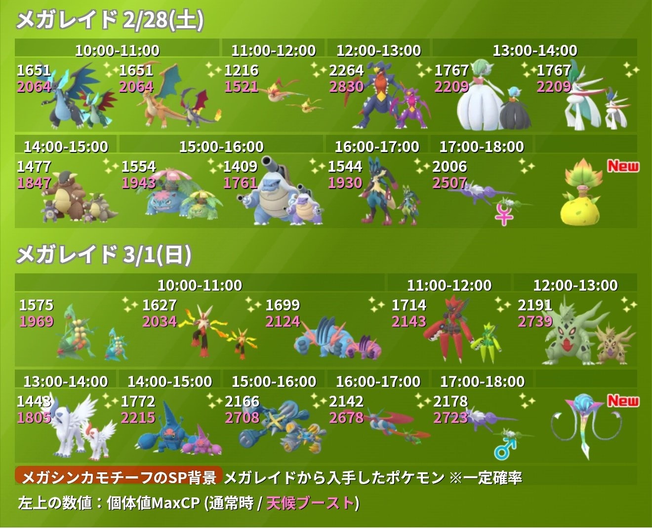 | 時段 | 出現的超級進化寶可夢 (100% CP 一般 / 天氣加成) |