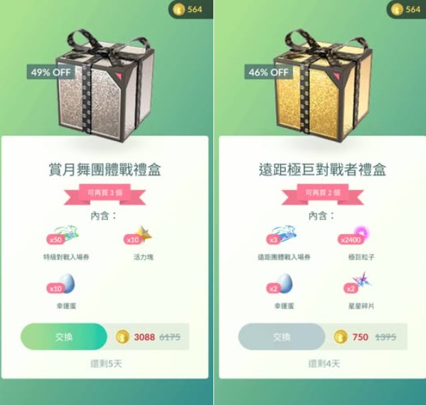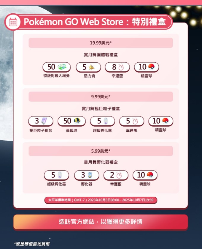 只要9.99美元*(或等值當地貨幣),即可購買「賞月舞極巨粒子禮盒」,獲得3個極巨粒子組合、50顆高級球、5個超級孵化器、5顆幸運蛋與10顆精靈球。